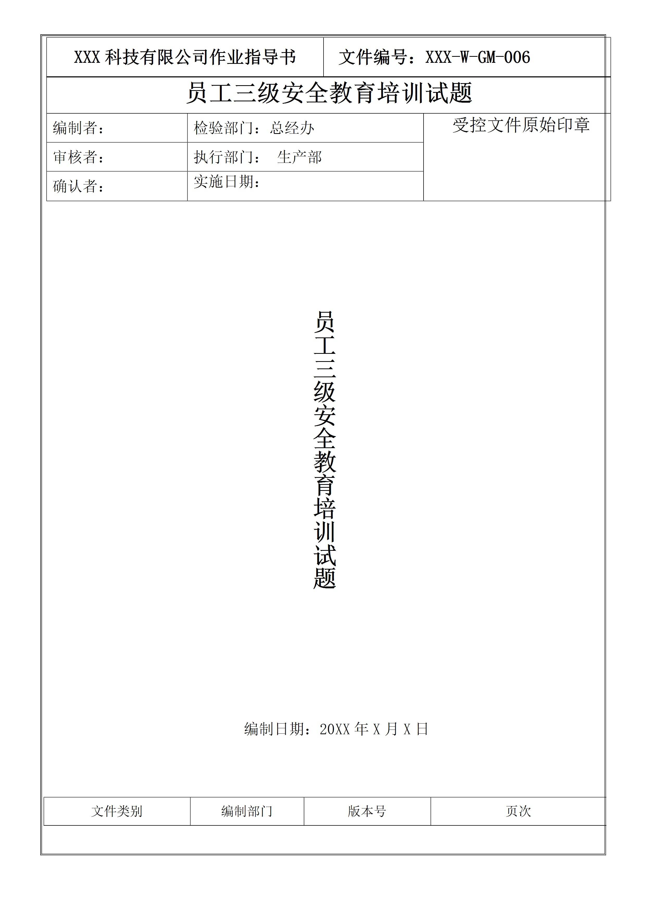 / 员工三级安全教育培训试题(原版台账)