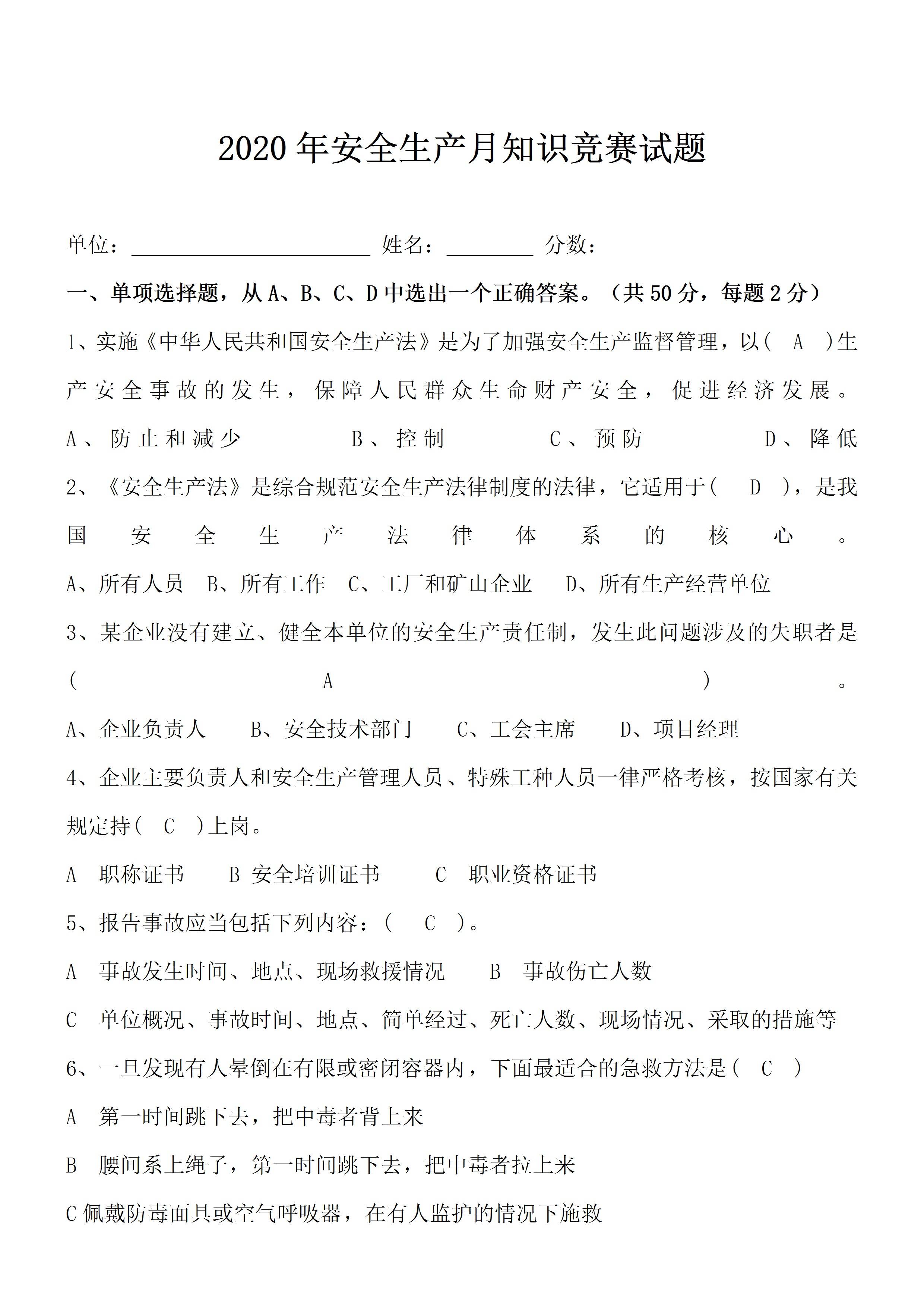 / 2020年安全生产月知识竞赛试题及答案(100题)