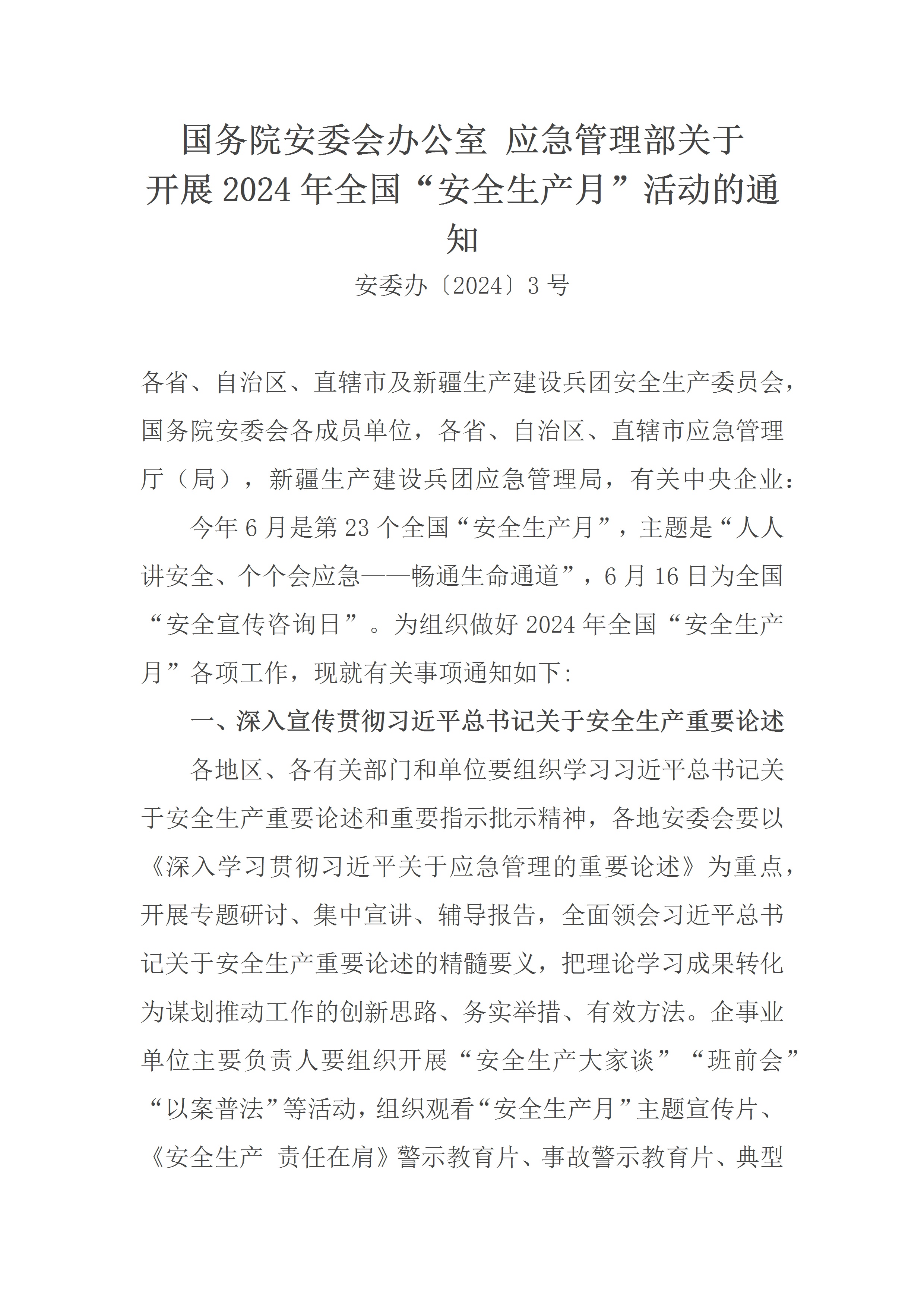 / 国务院安委会办公室 应急管理部关于开展2024年全国“安全生产月”活动的通知