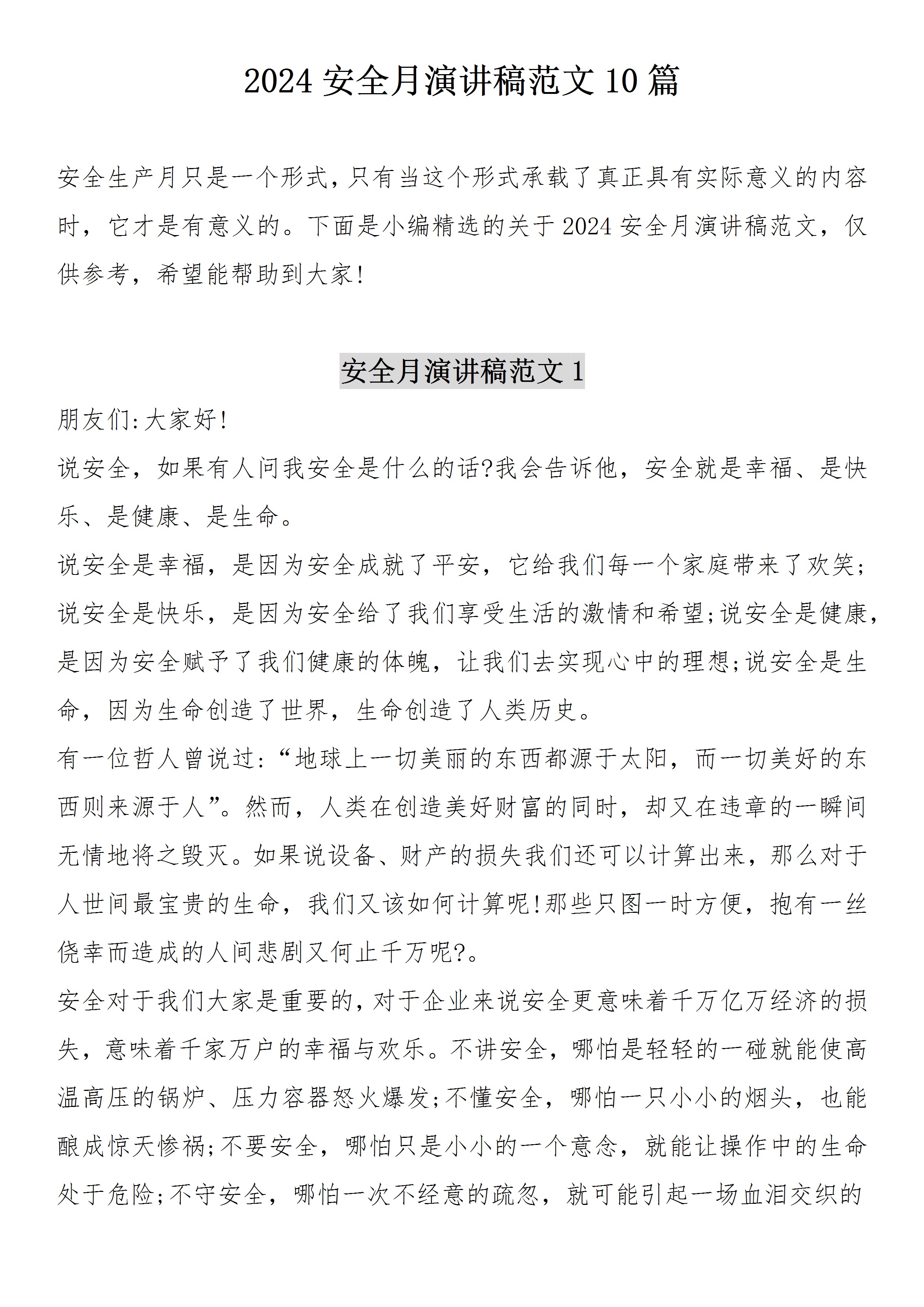/ 2024安全生产月主题演讲稿汇编(22页)