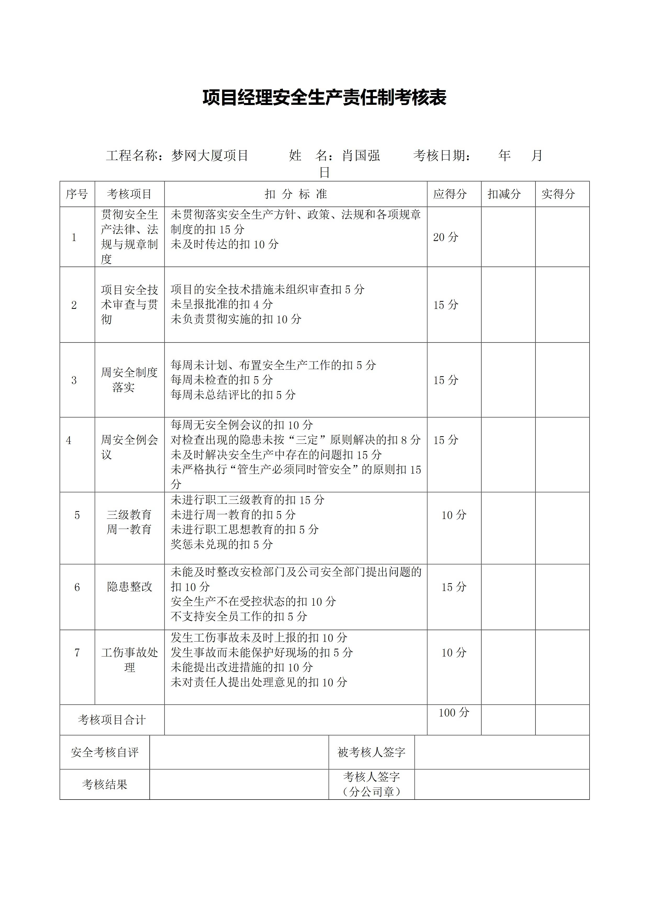 / [考核]项目管理人员安全生产责任制考核记录表[文档]