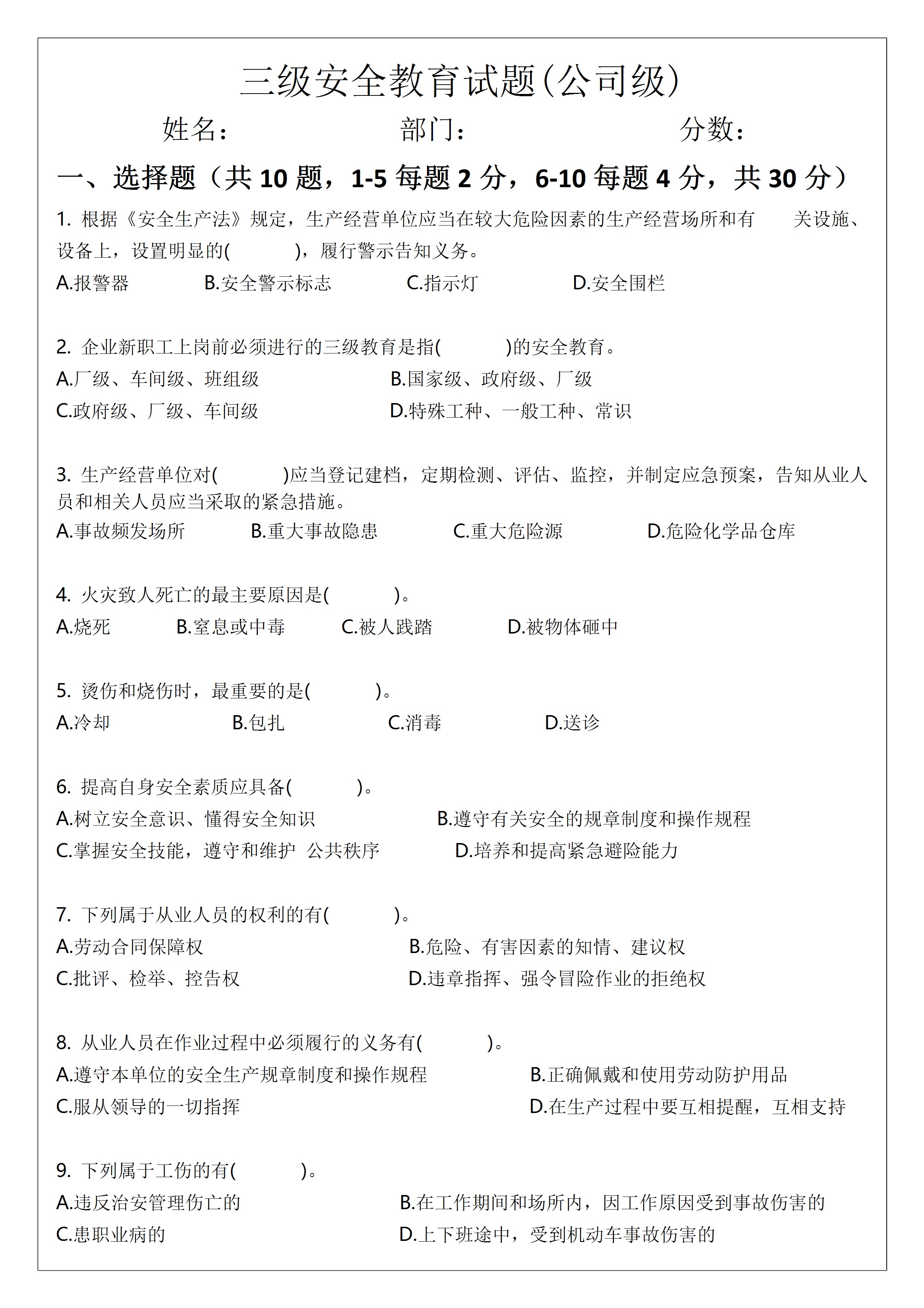 / 三级安全教育试题(公司级、部门级、班组级)