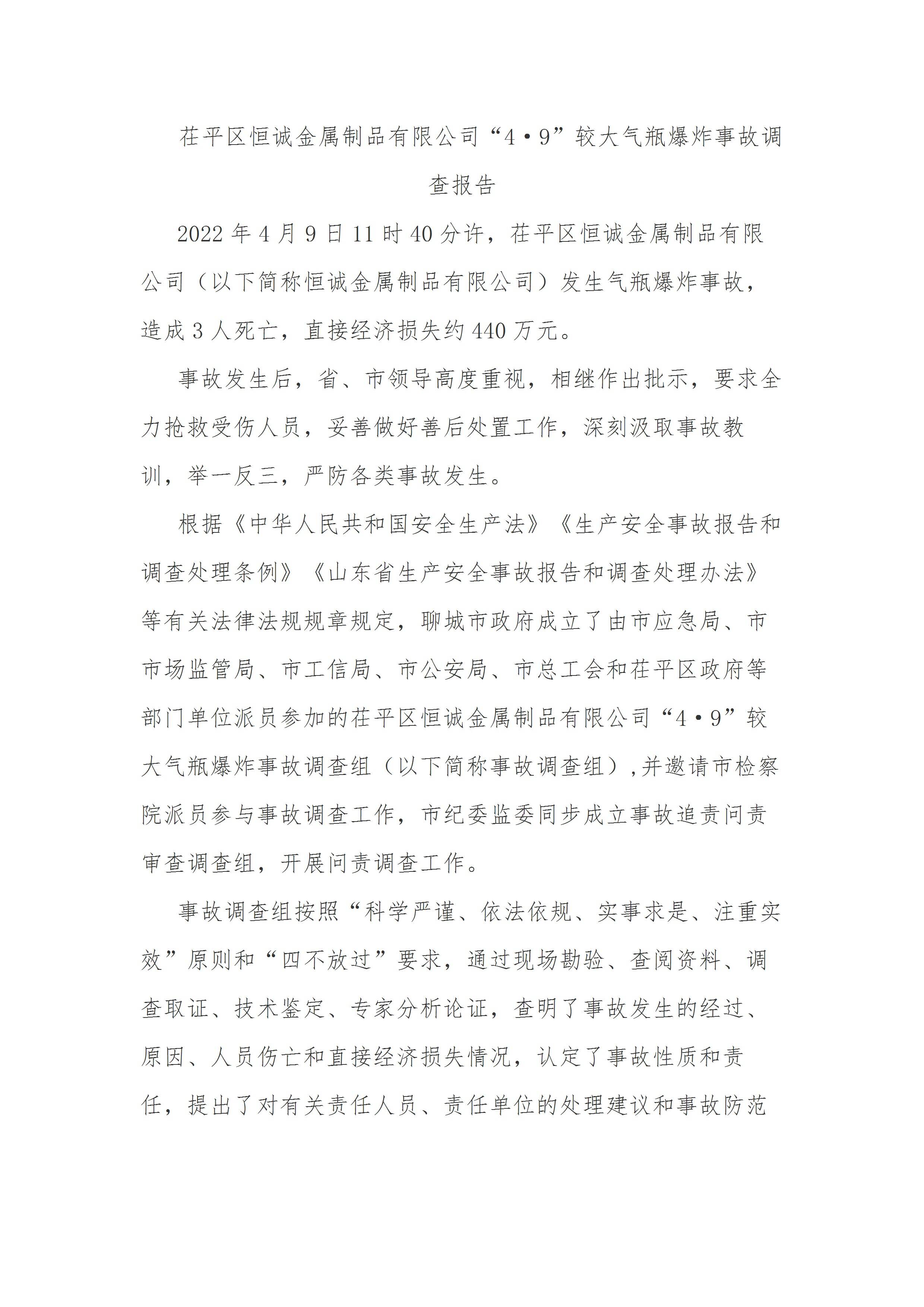 / 恒诚金属制品有限公司“4·9” 较大气瓶爆炸事故调查报告