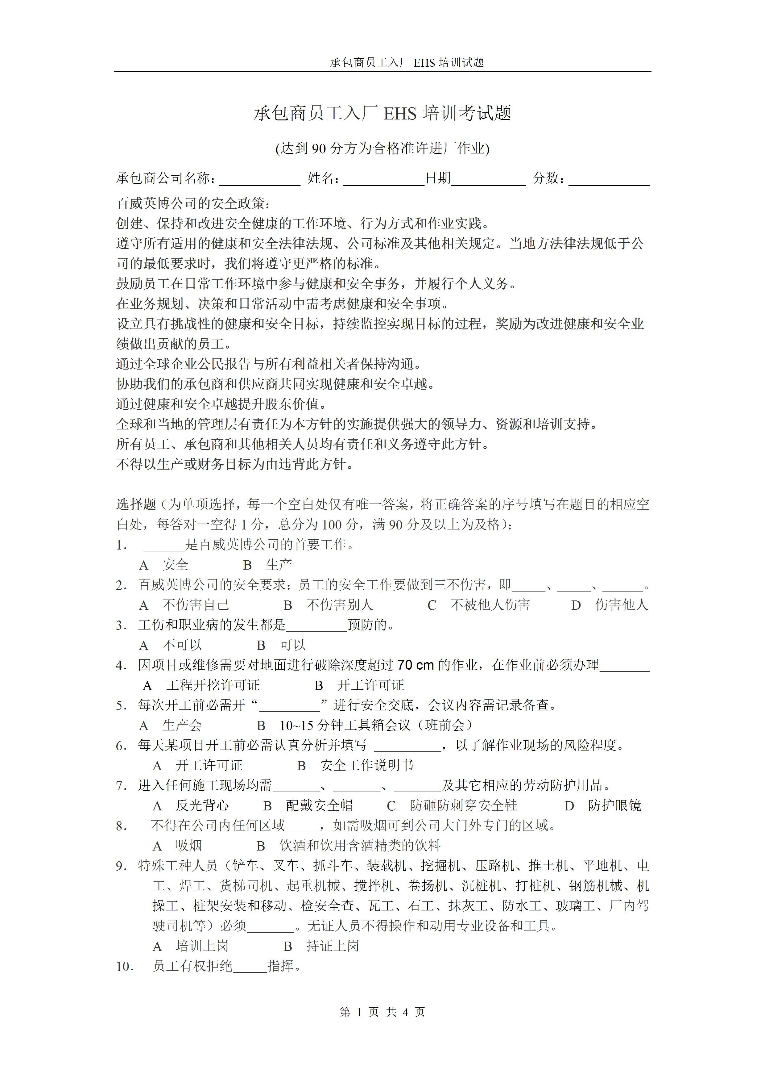 / 承包商入厂安全培训考试试题1