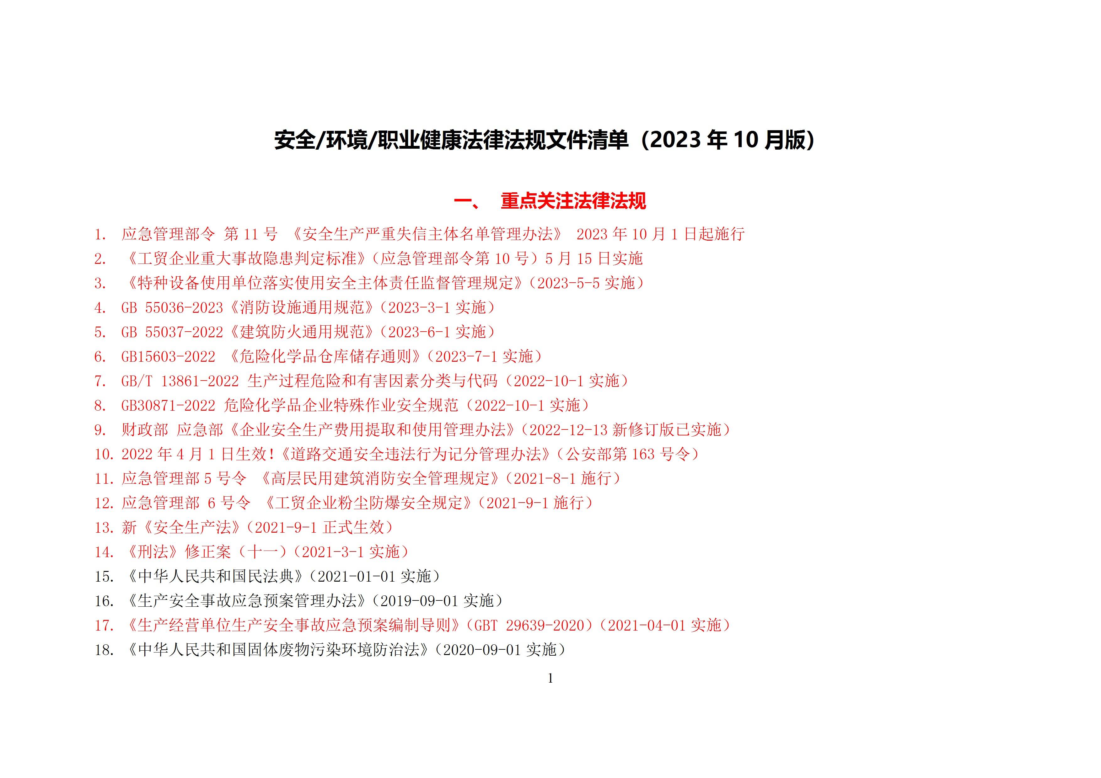 / 安全生产法律法规清单(2023年10月版)[文档]