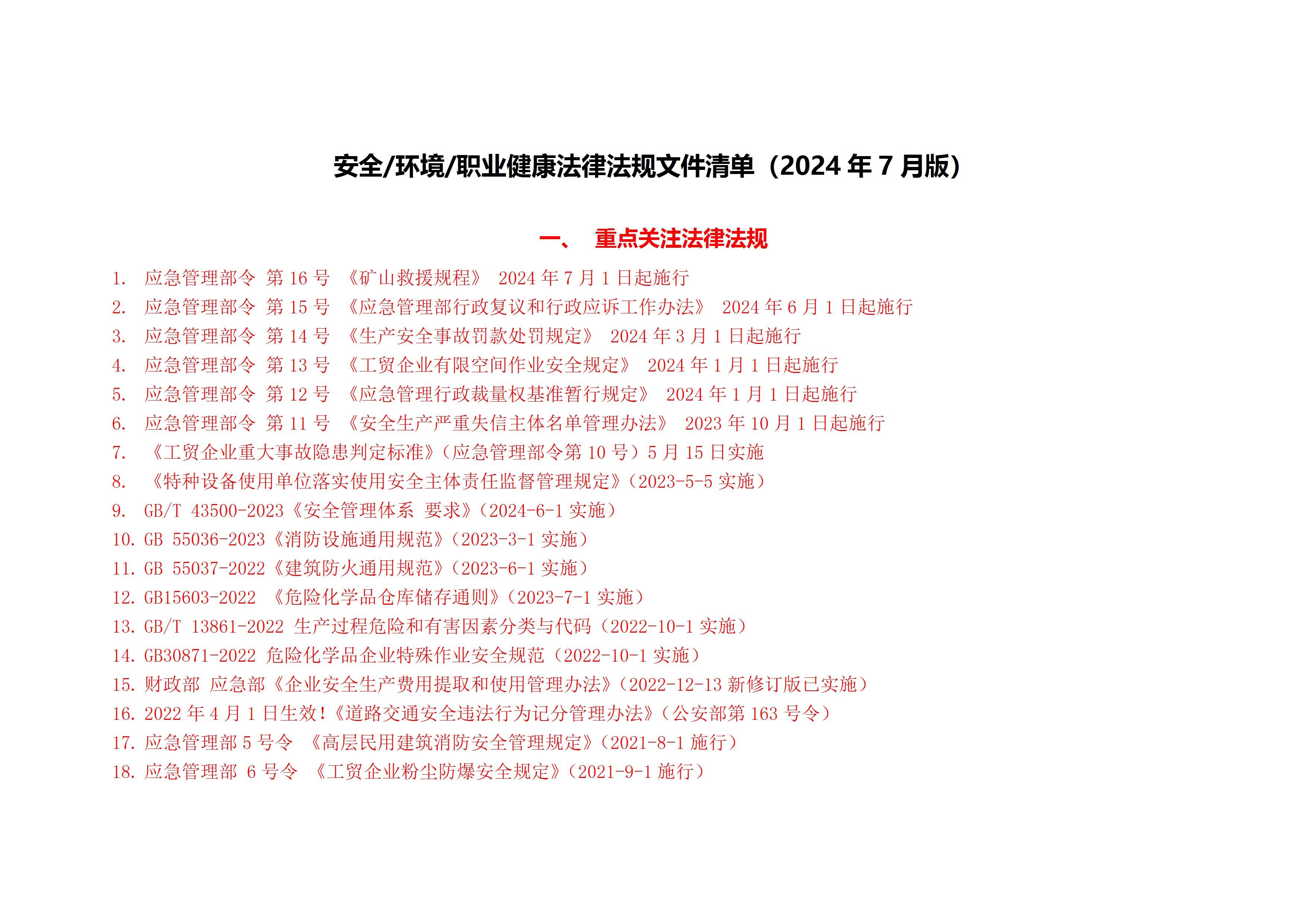 / 安全生产法律法规清单(2024年7月版)[文档]