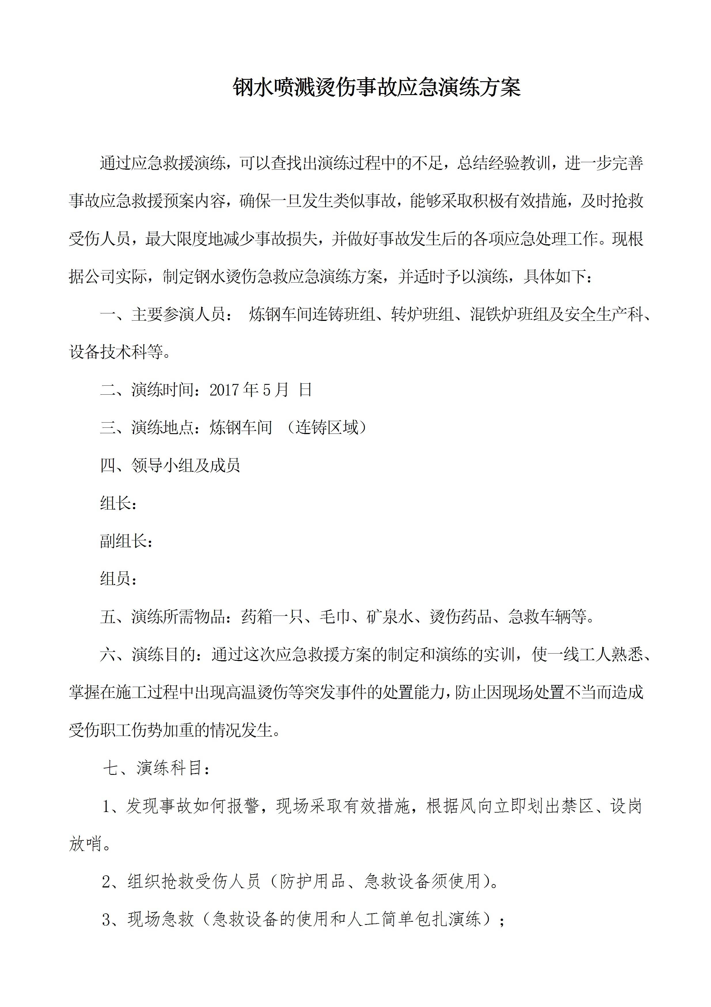 / 【演练方案】钢水喷溅烫伤事故应急演练方案(6页)