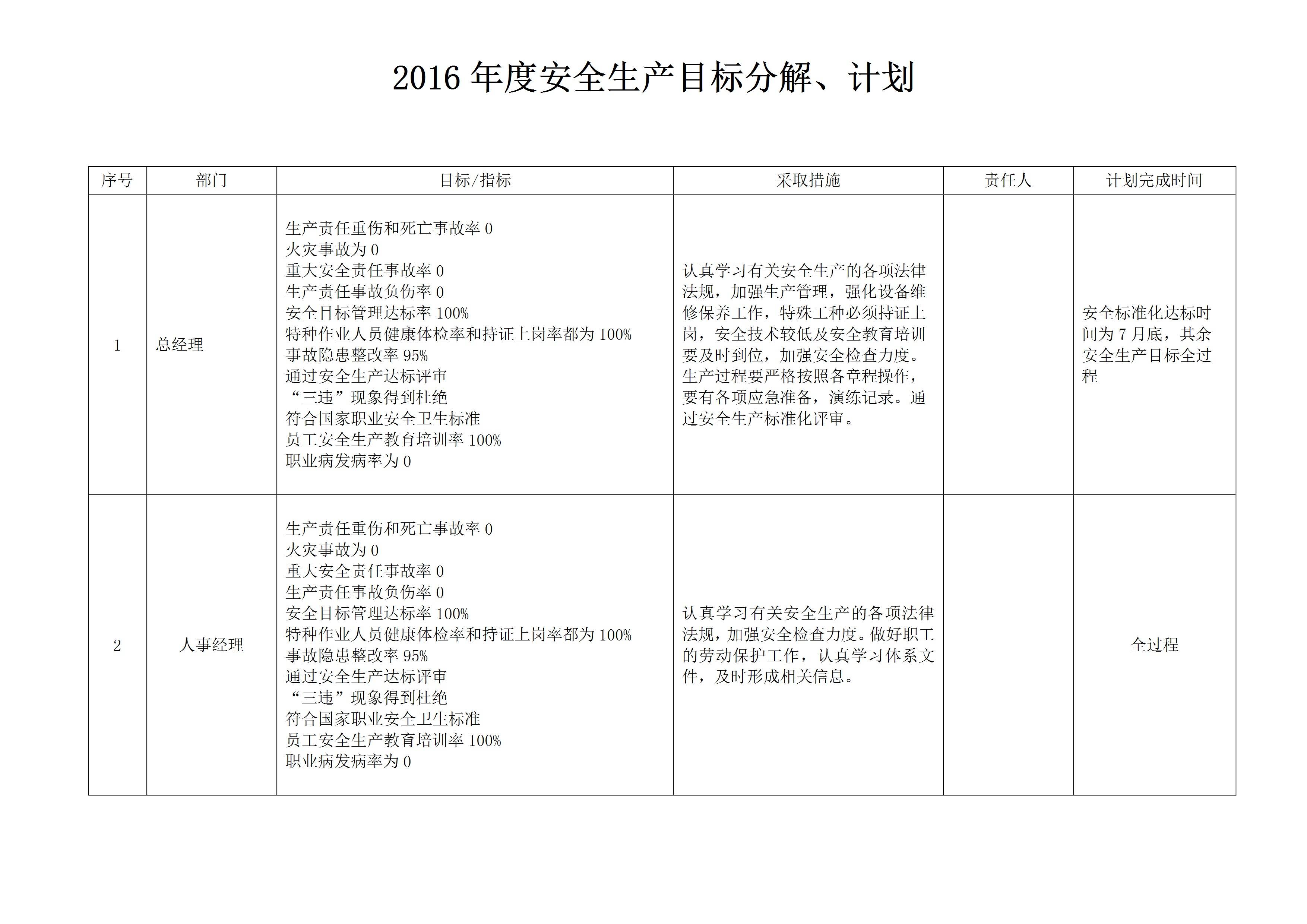 年度安全生产目标分解计划