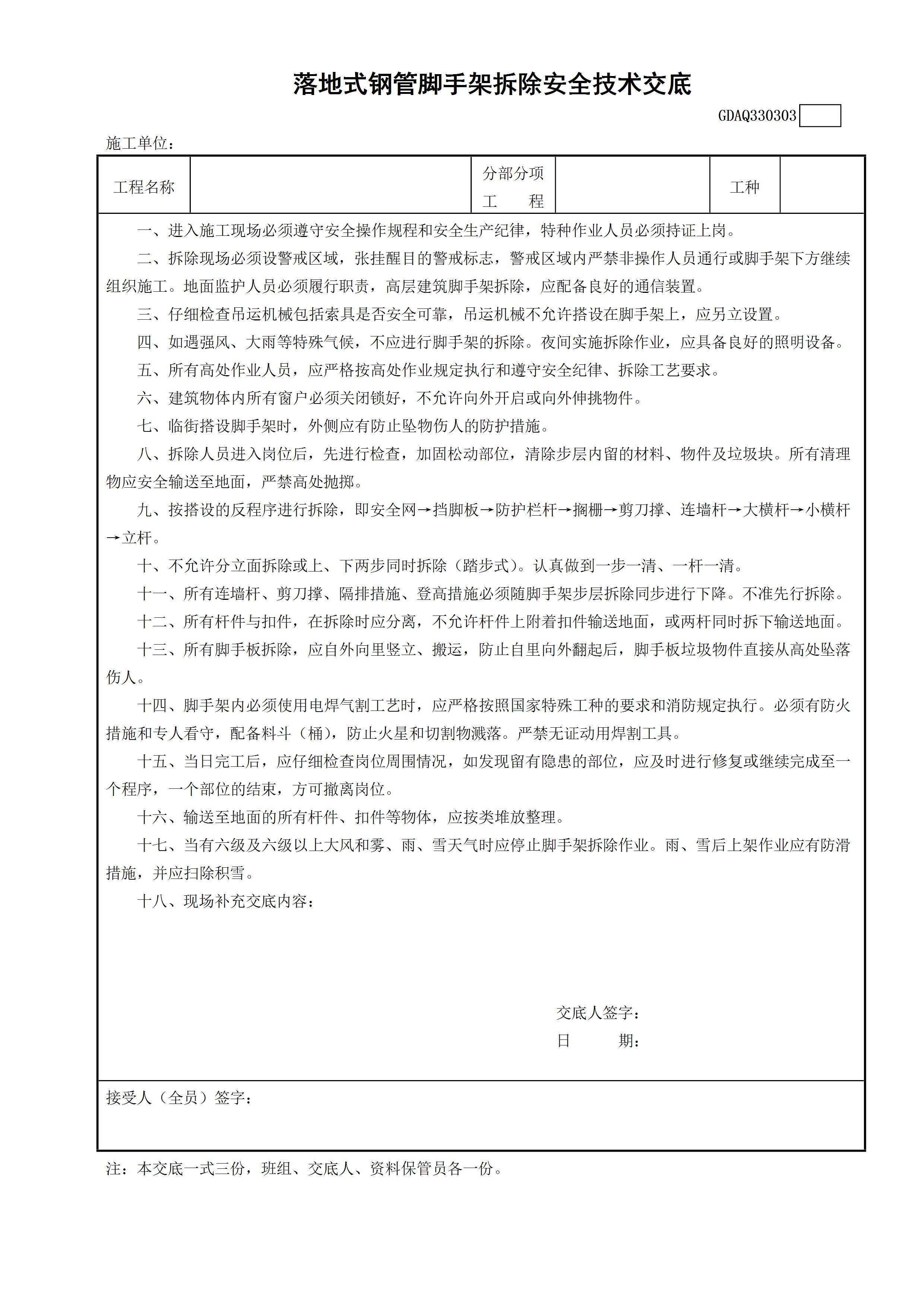 / 落地式钢管外脚手架拆除安全技术交底GDAQ330303