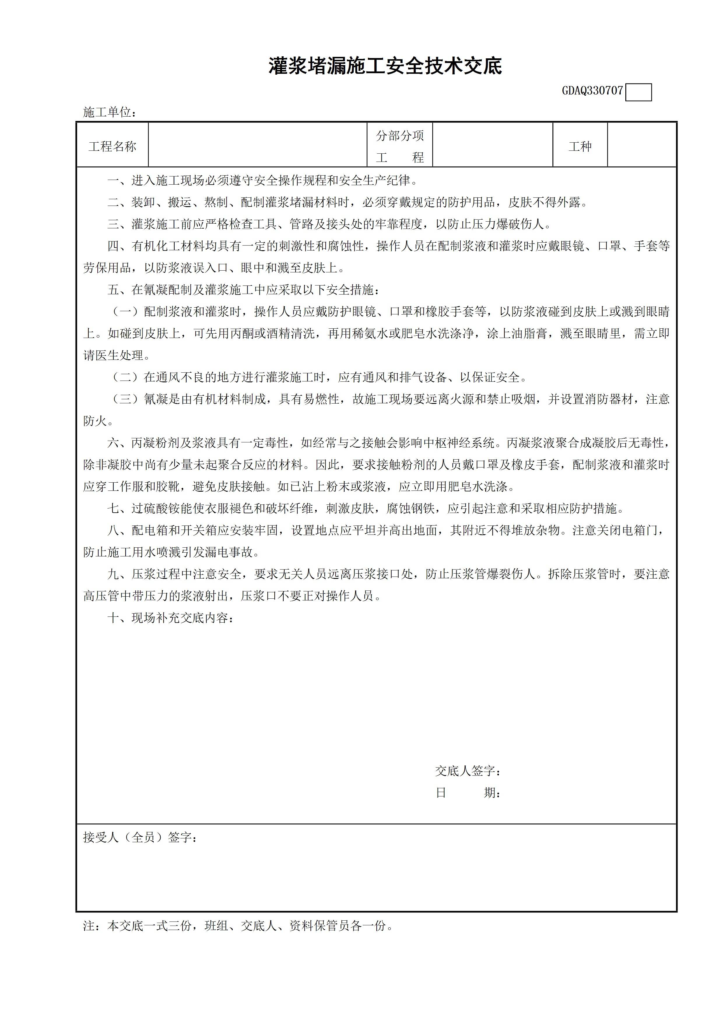 / 灌浆堵漏施工安全技术交底GDAQ330707