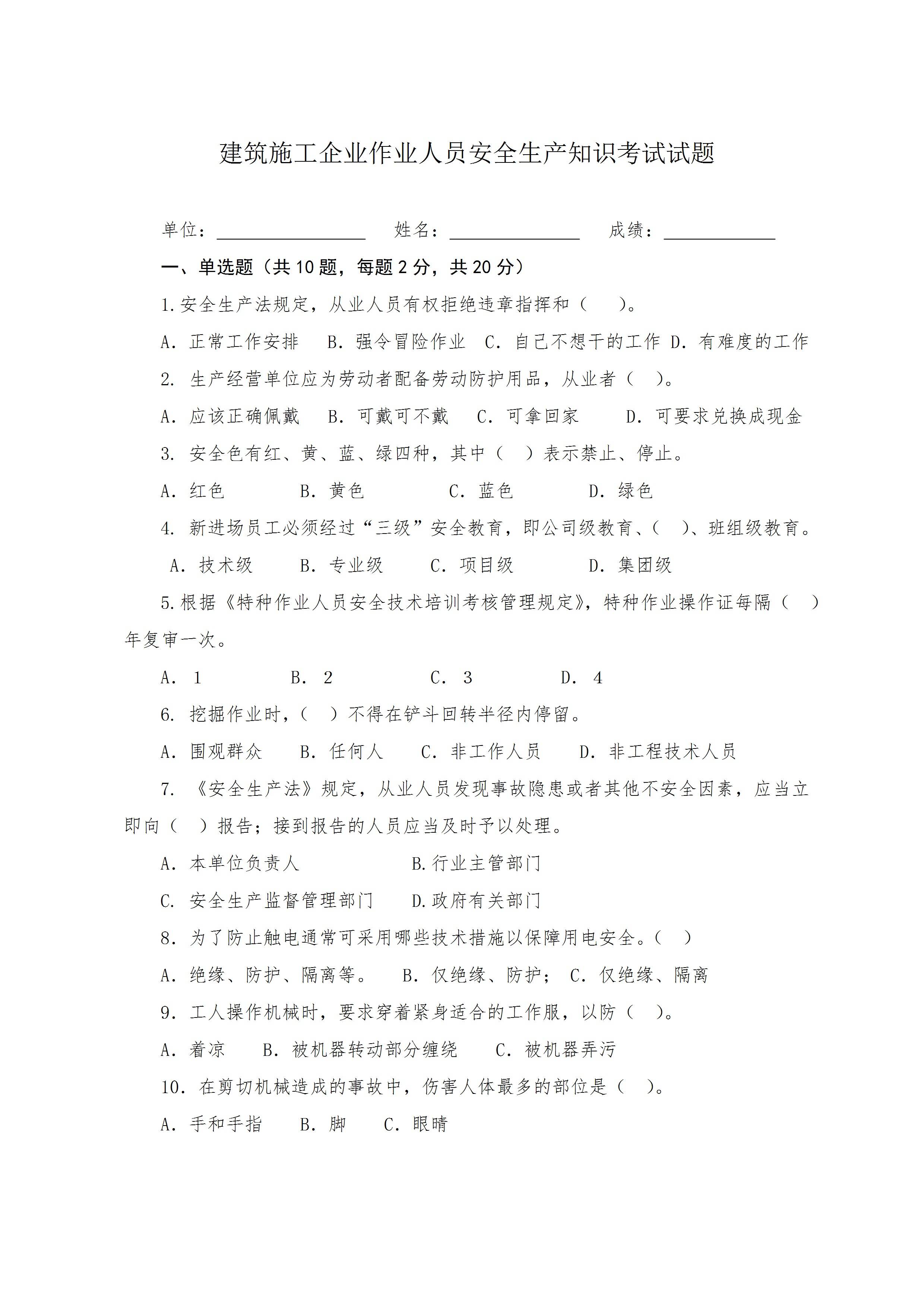/ 建筑施工企业作业人员安全生产知识考试试题
