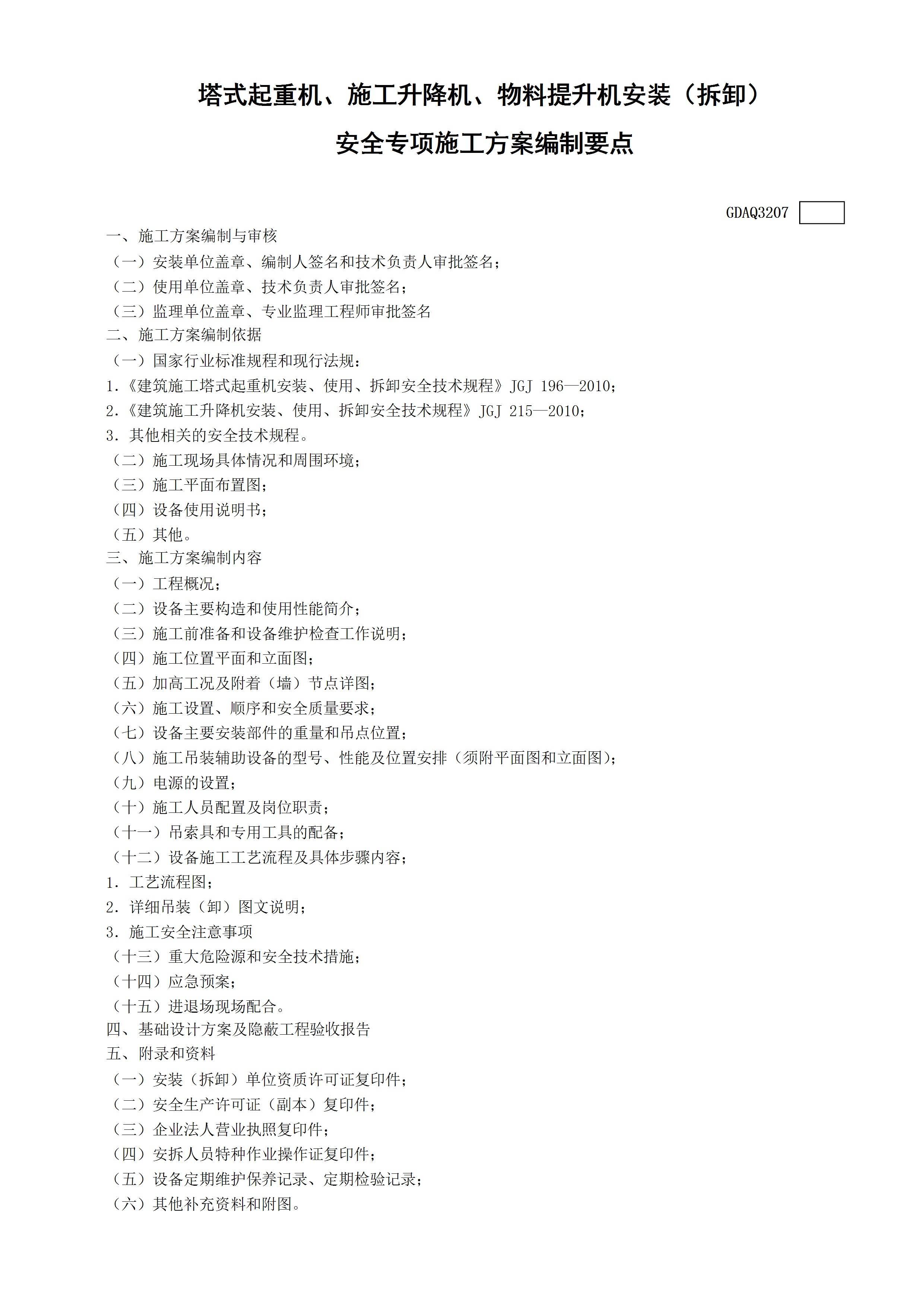 塔式起重机、施工升降机、物料提升机安装(拆卸)安全专项施工方案编制要点GDAQ3207