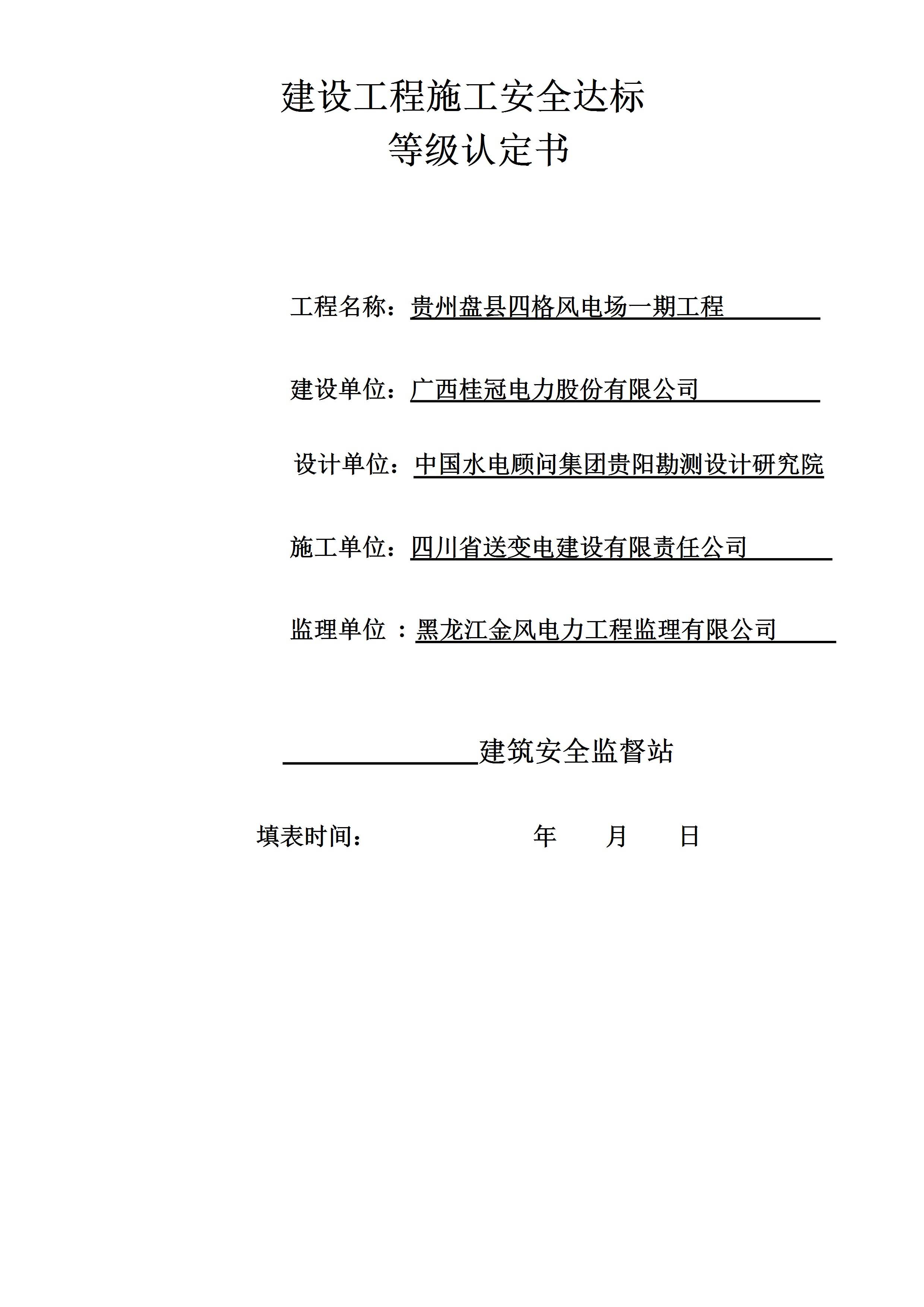 四格建设工程施工安全达标等级认定书