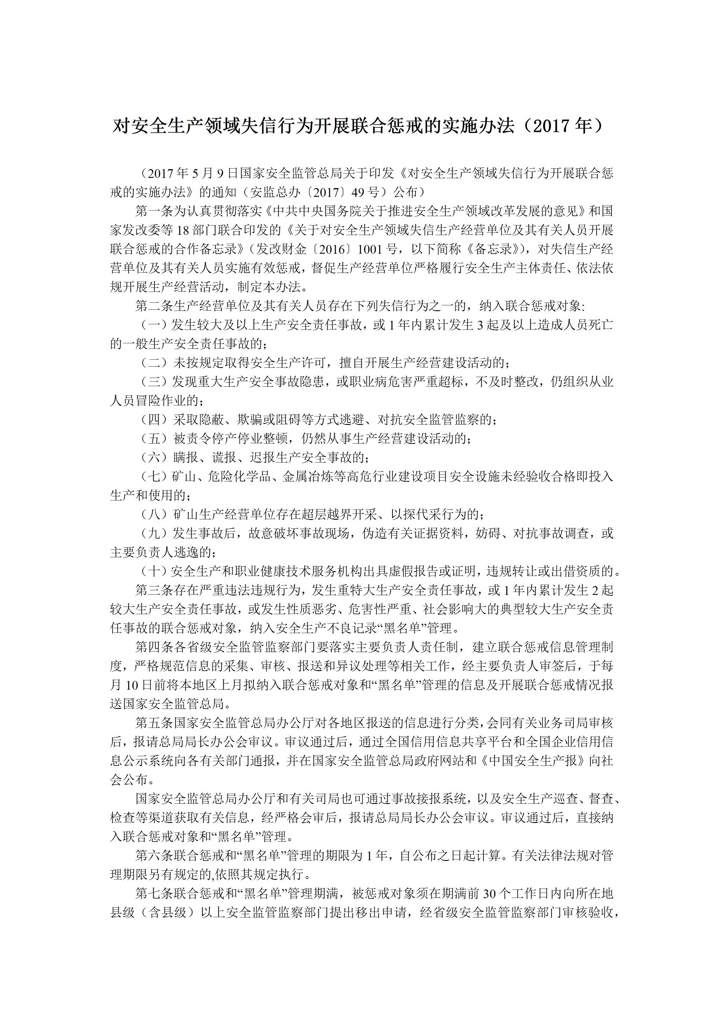 / 对安全生产领域失信行为开展联合惩戒的实施办法(2017年)