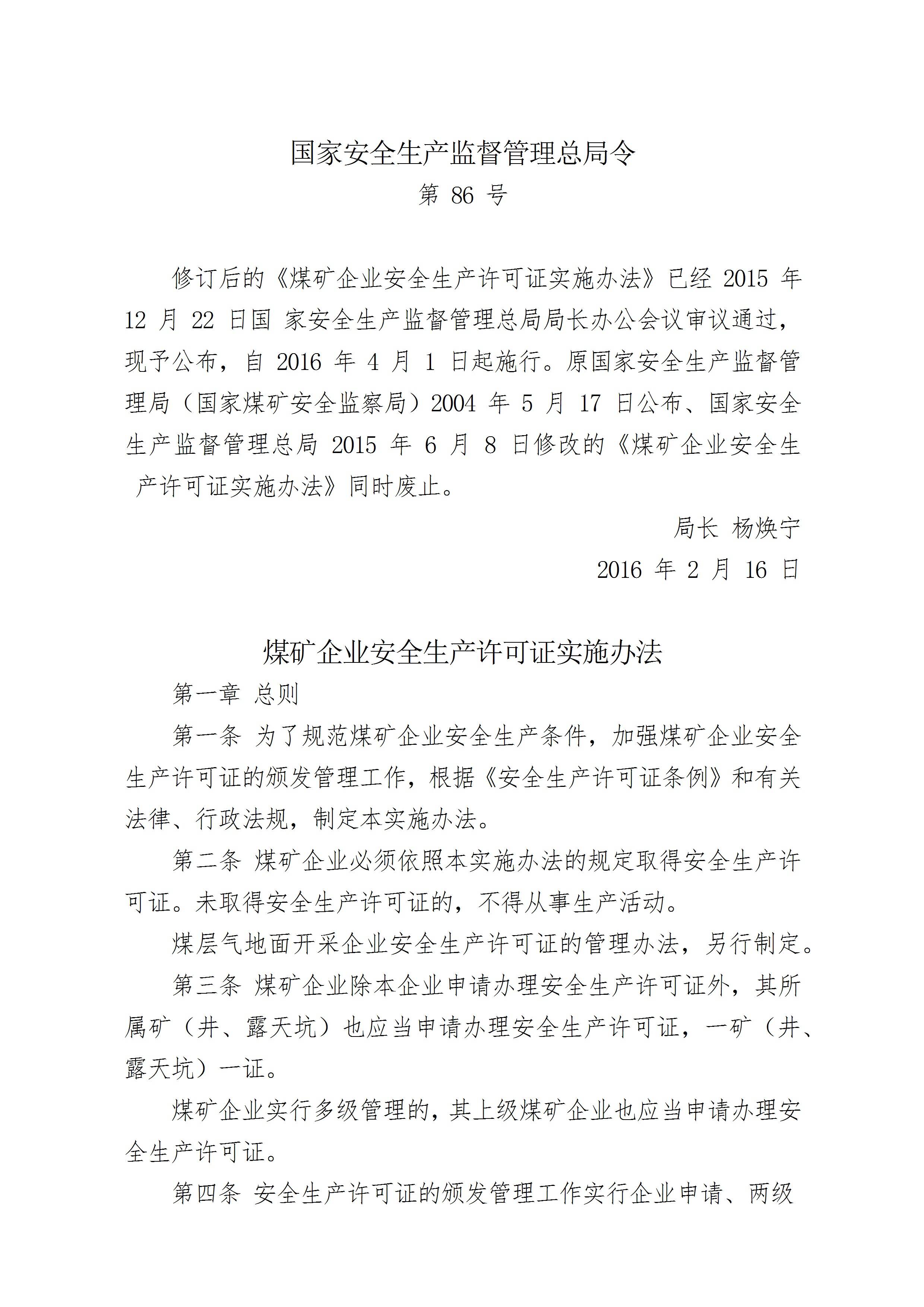国家安监总局令26第86号《煤矿企业安全生产许可证实施办法》
