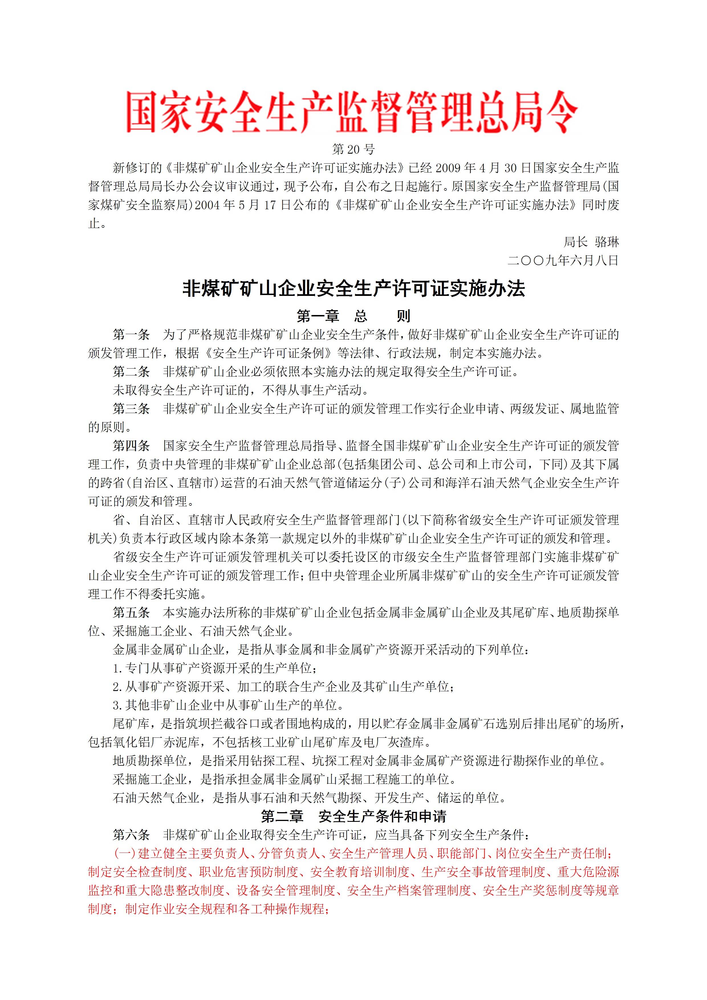 / 国家安监总局令2009第20号非煤矿矿山企业安全生产许可证实施办法