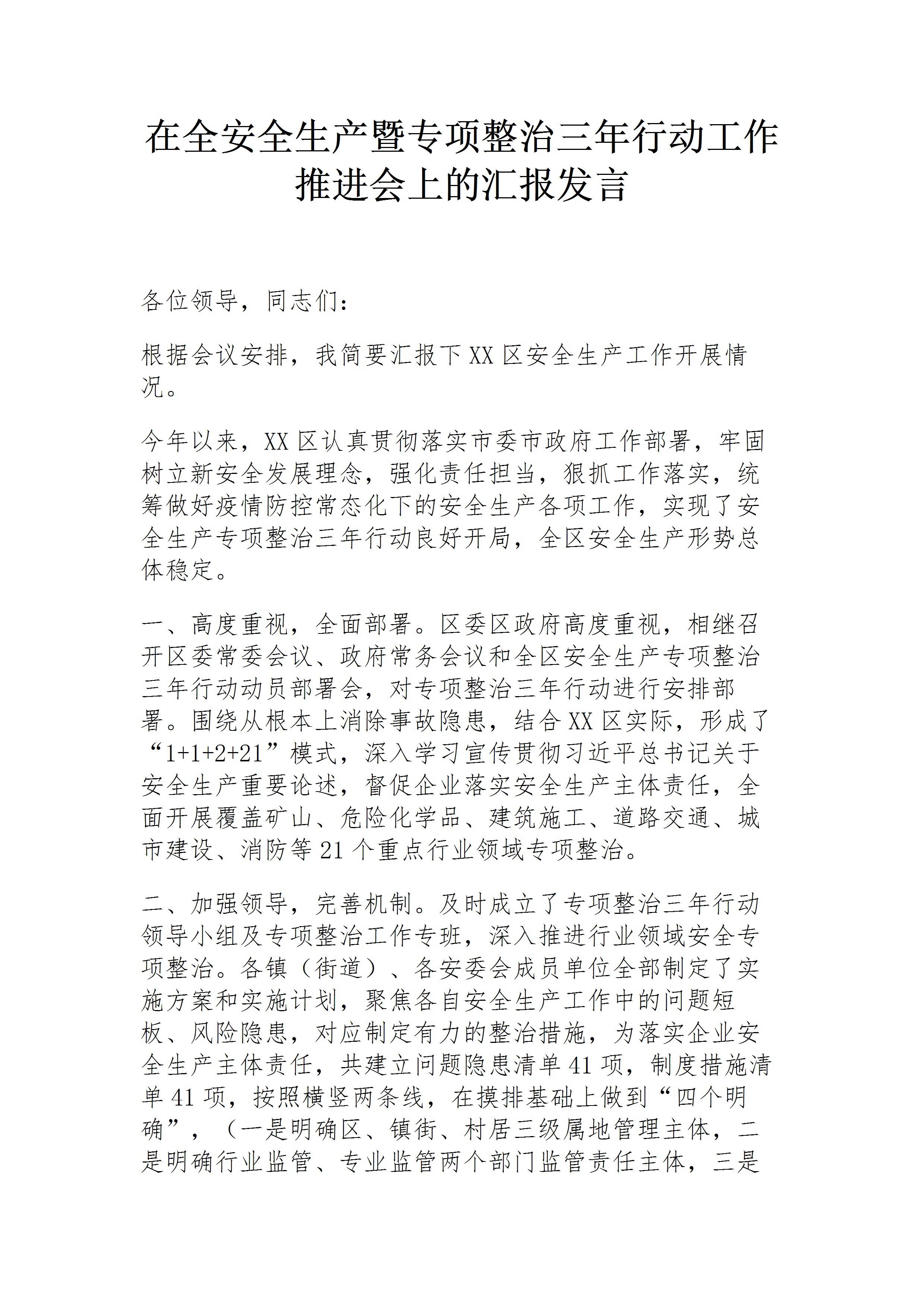 / 安全生产暨专项整治三年行动工作推进会汇报发言[文档]