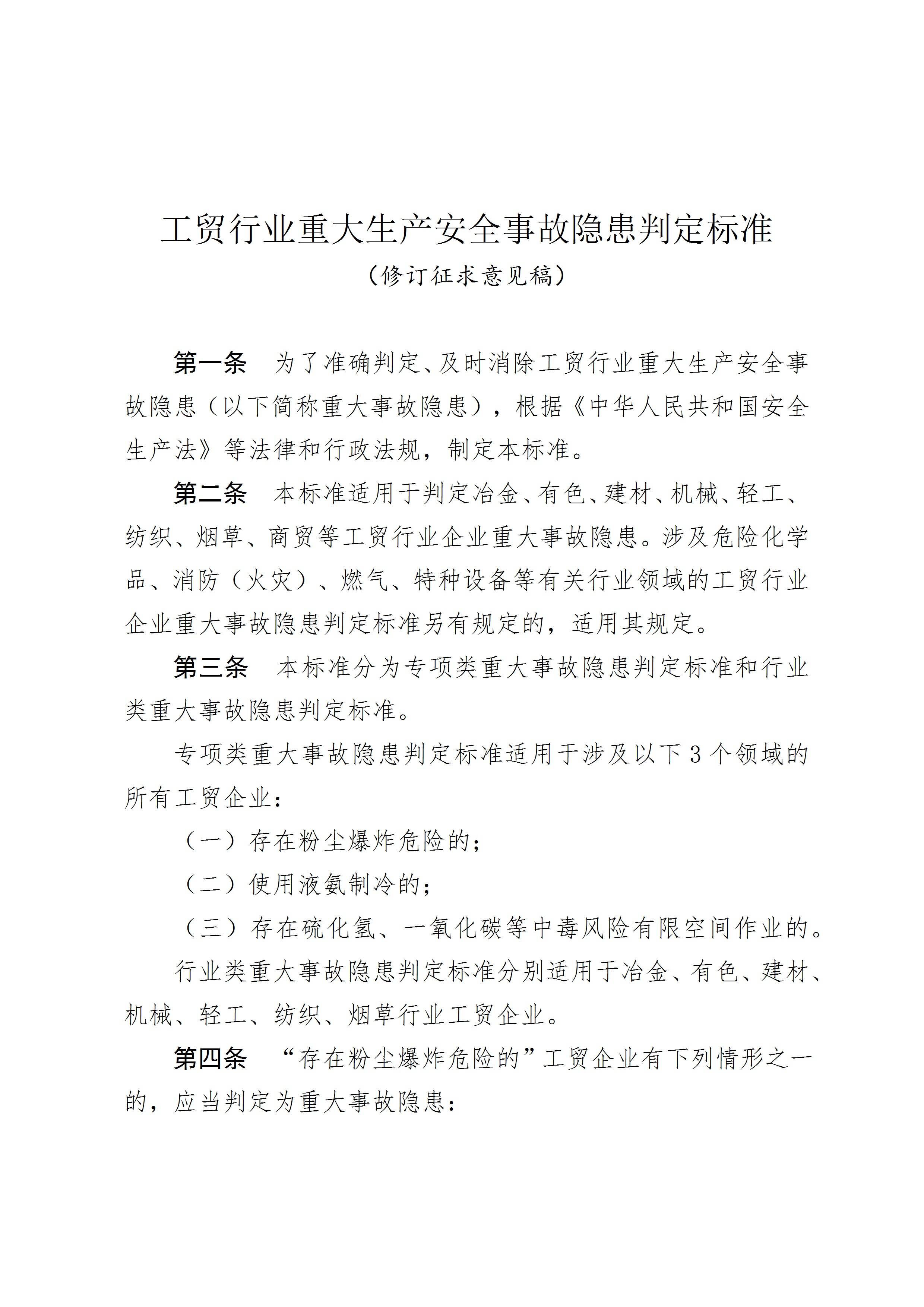 / 工贸行业重大生产安全事故隐患判定标准修订征求意见稿[文档]