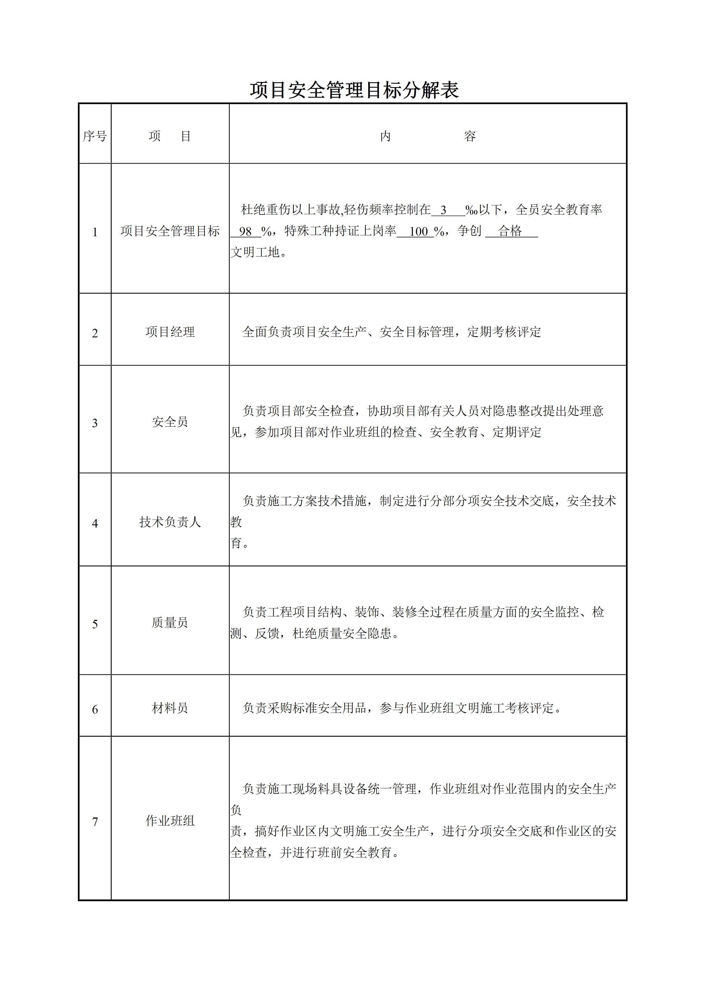 项目部安全责任目标分解表[文档版]