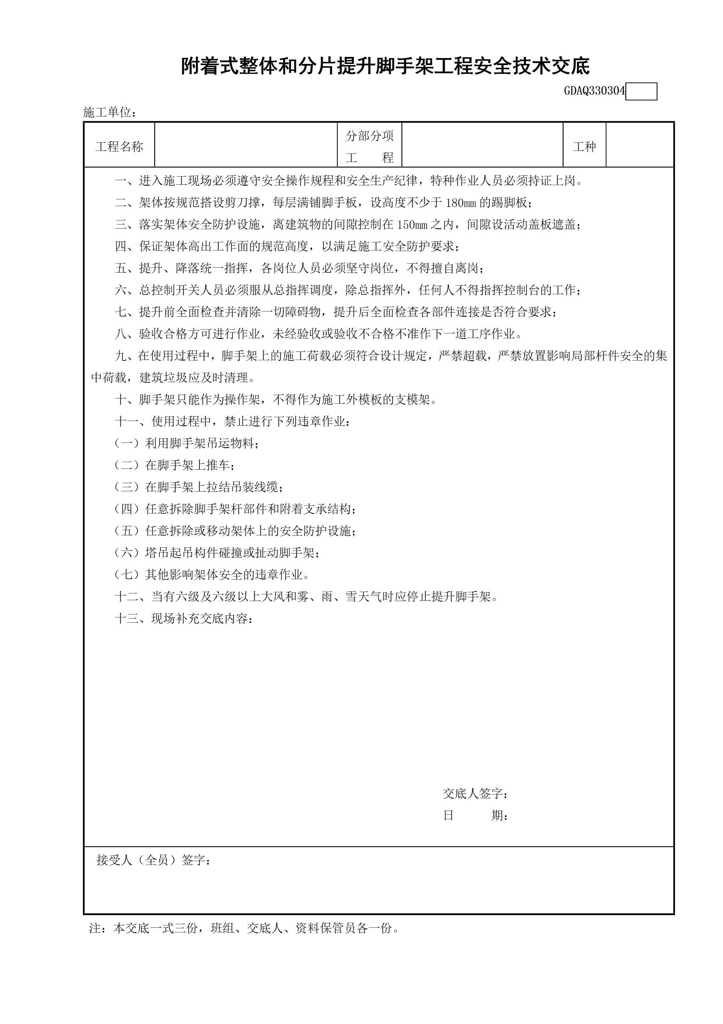/ 整体和分片提升脚手架工程安全技术交底GDAQ330304[文档]