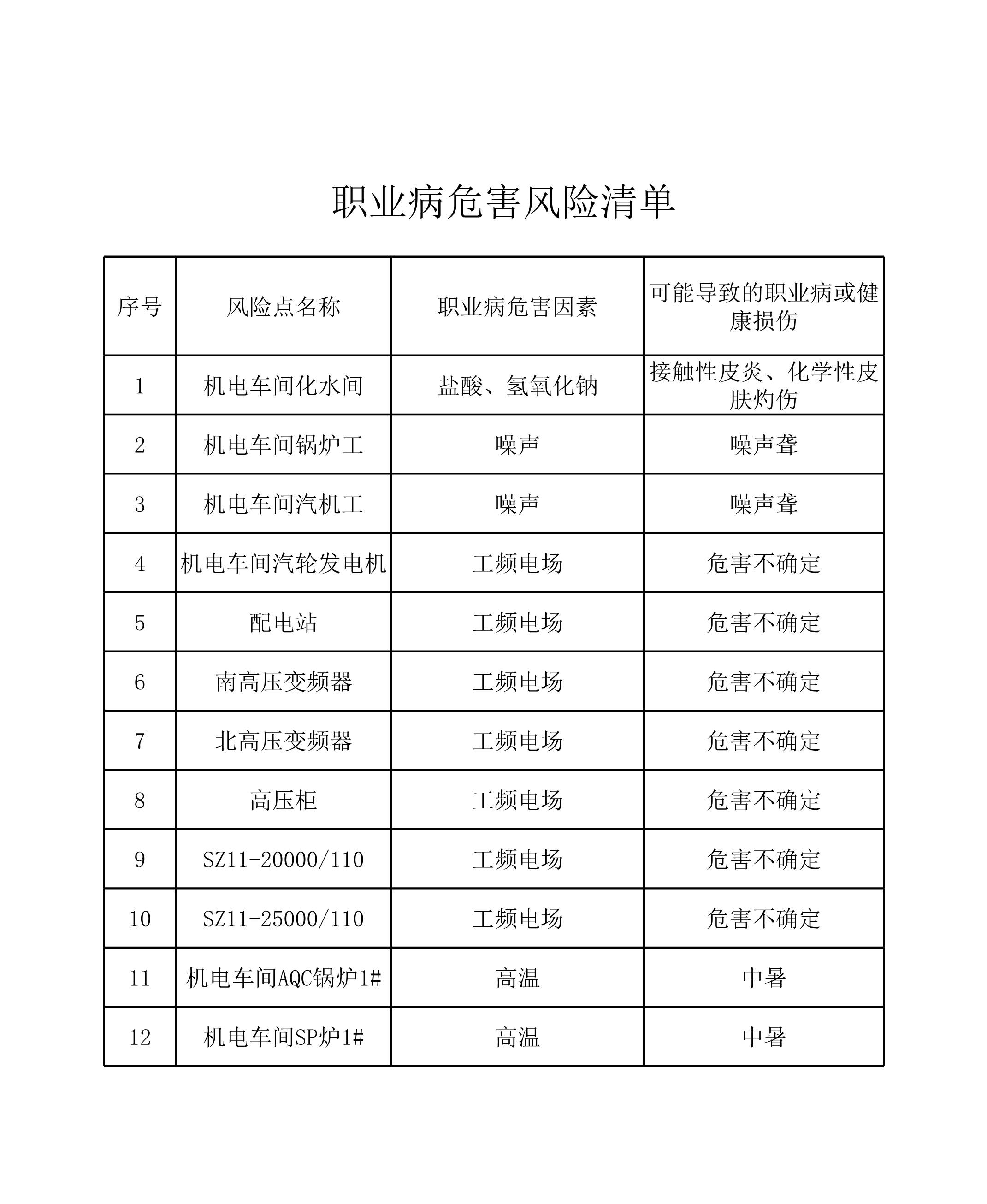 xx车间职业病危害风险清单[表格]