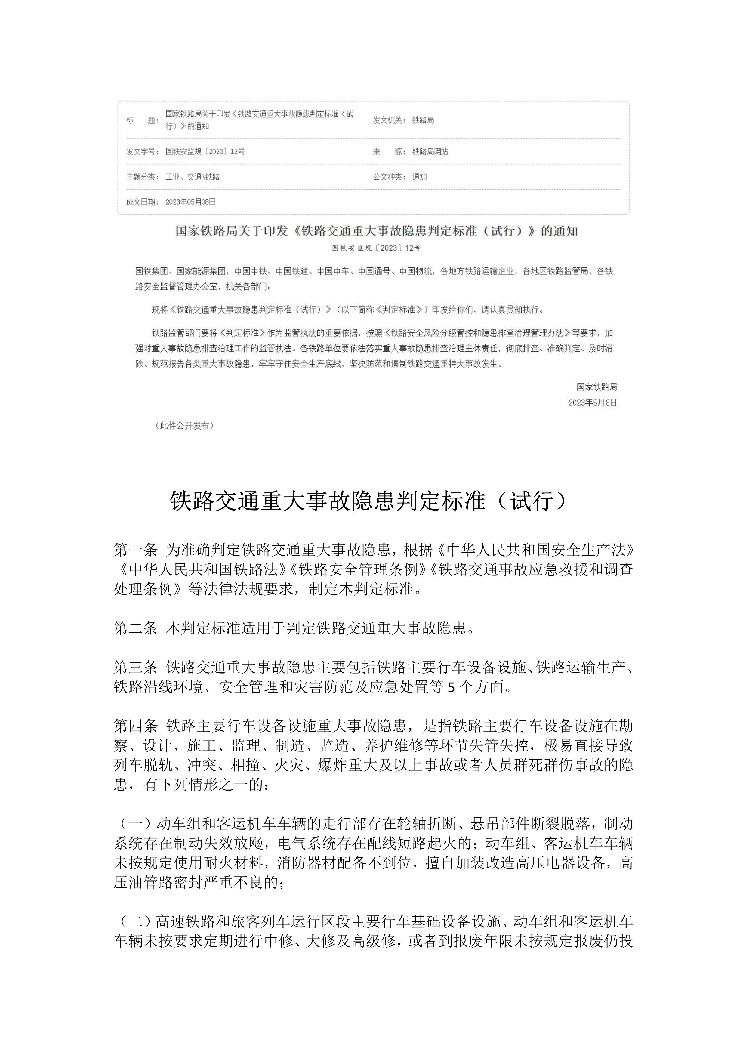 铁路交通重大事故隐患判定标准试行国铁安监规2023 12号[PDF]