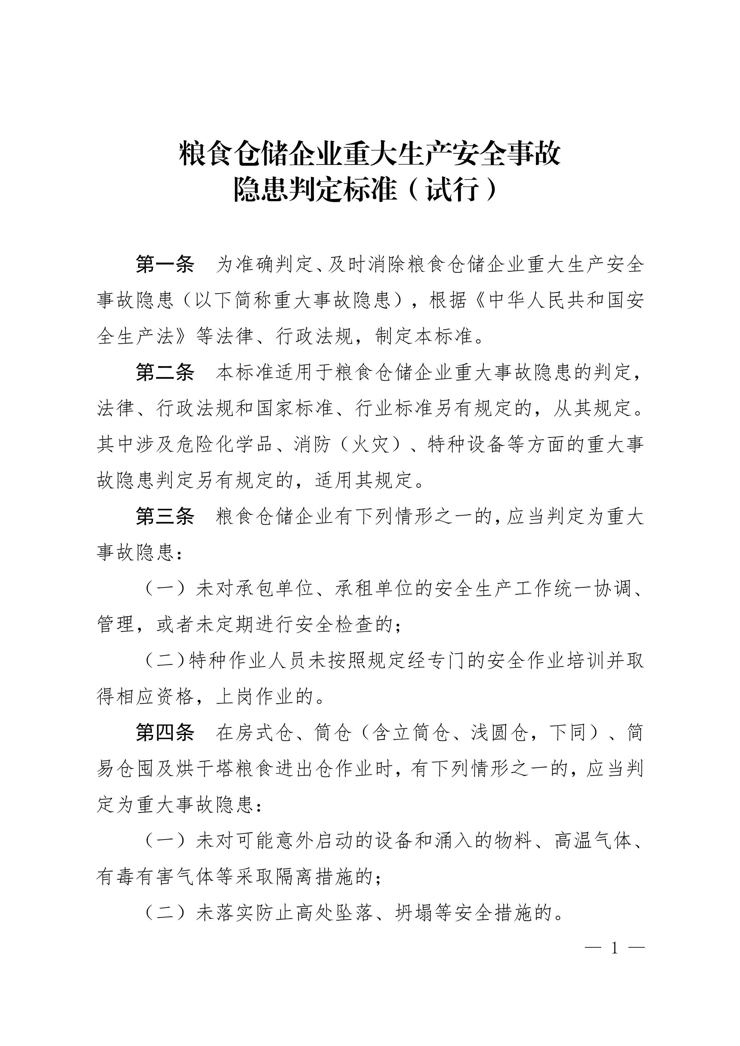 粮食仓储企业重大生产安全事故隐患判定标准试行国粮办应急2023155号[PDF]