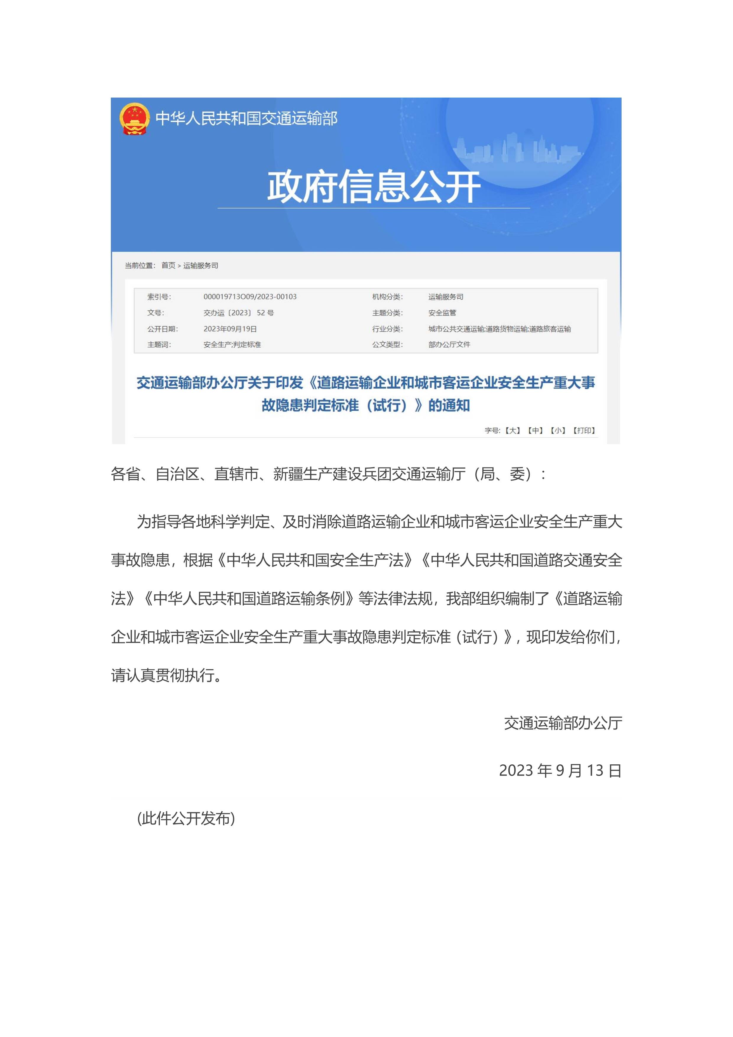 道路运输企业和城市客运企业安全生产重大事故隐患判定标准试行交办运2023 52号[PDF]