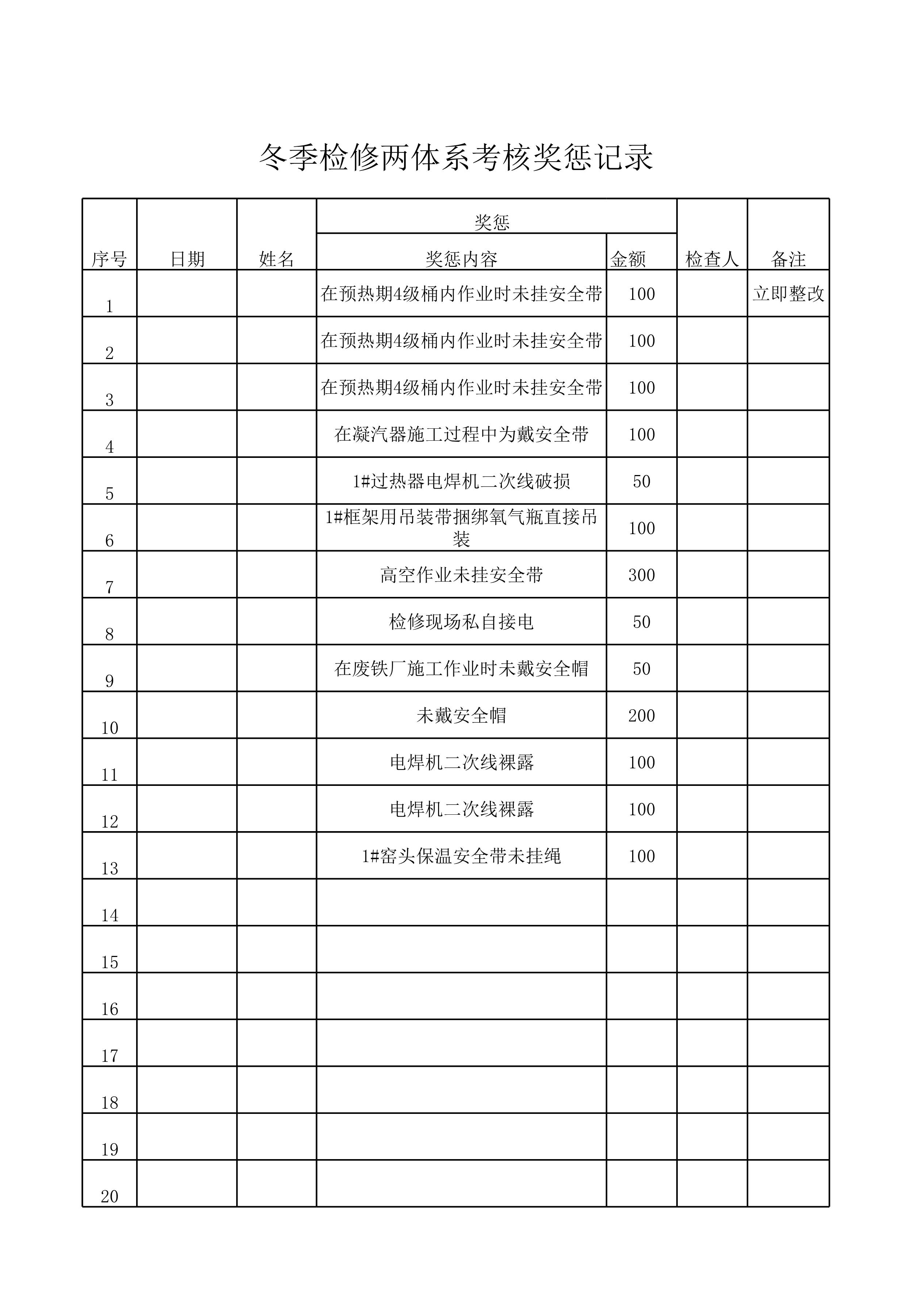 / 冬季检修期间两体系考核奖惩记录[表格]