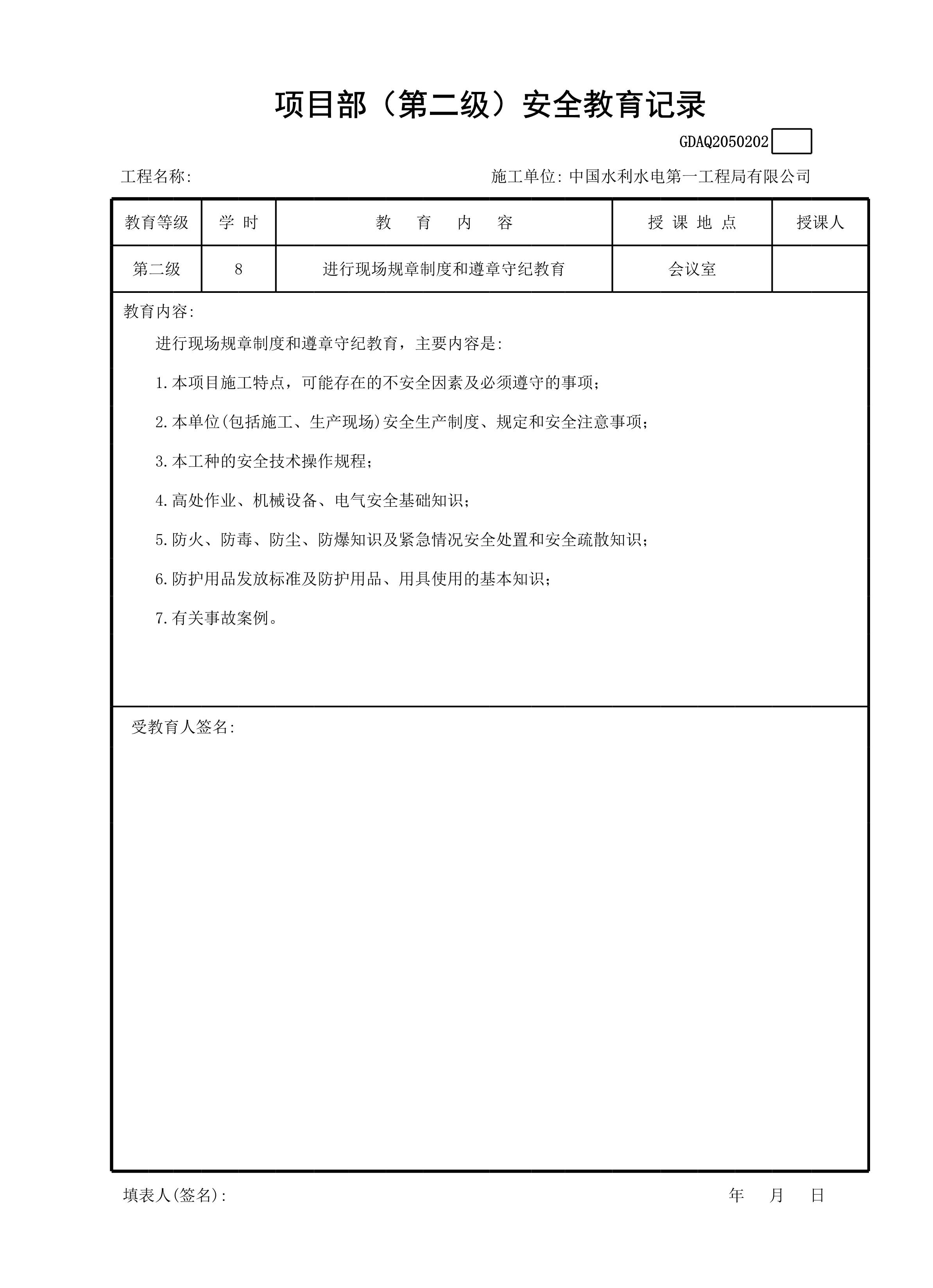 / 项目部(第二级)安全教育记录GDAQ2050202[表格]