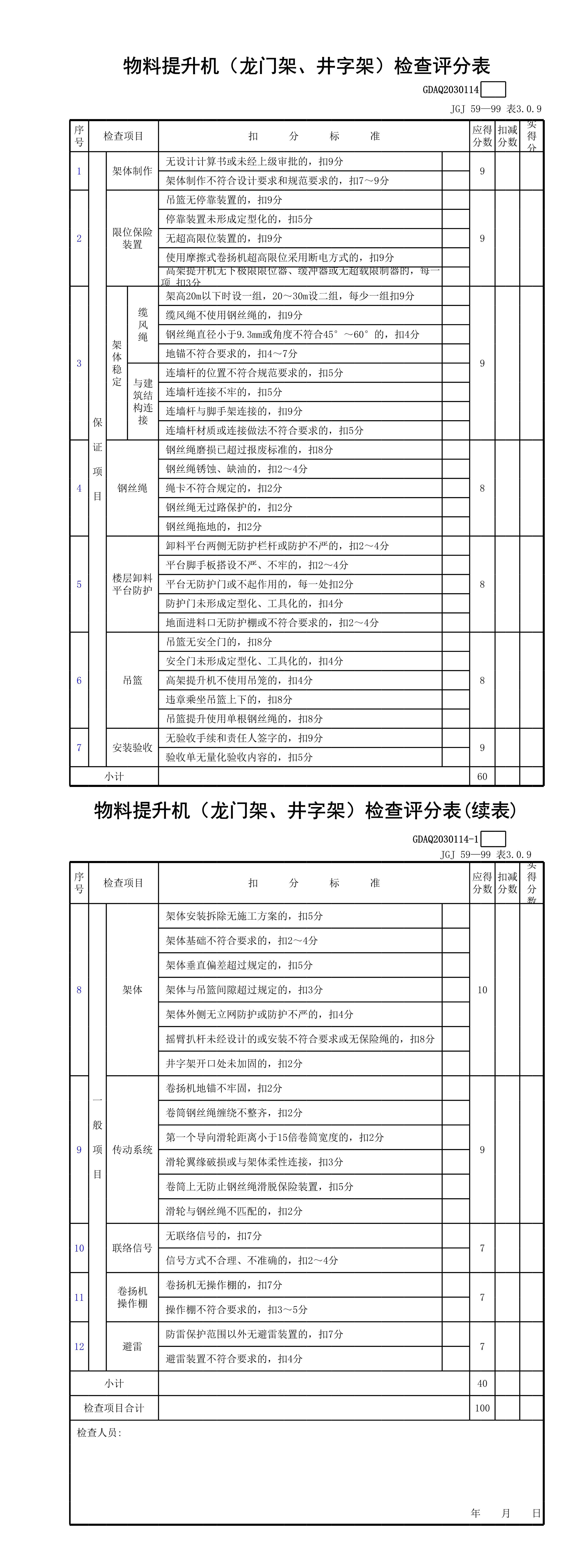 物料提升机(龙门架,井字架)检查评分表(含续表)GDAQ2030114[表格]