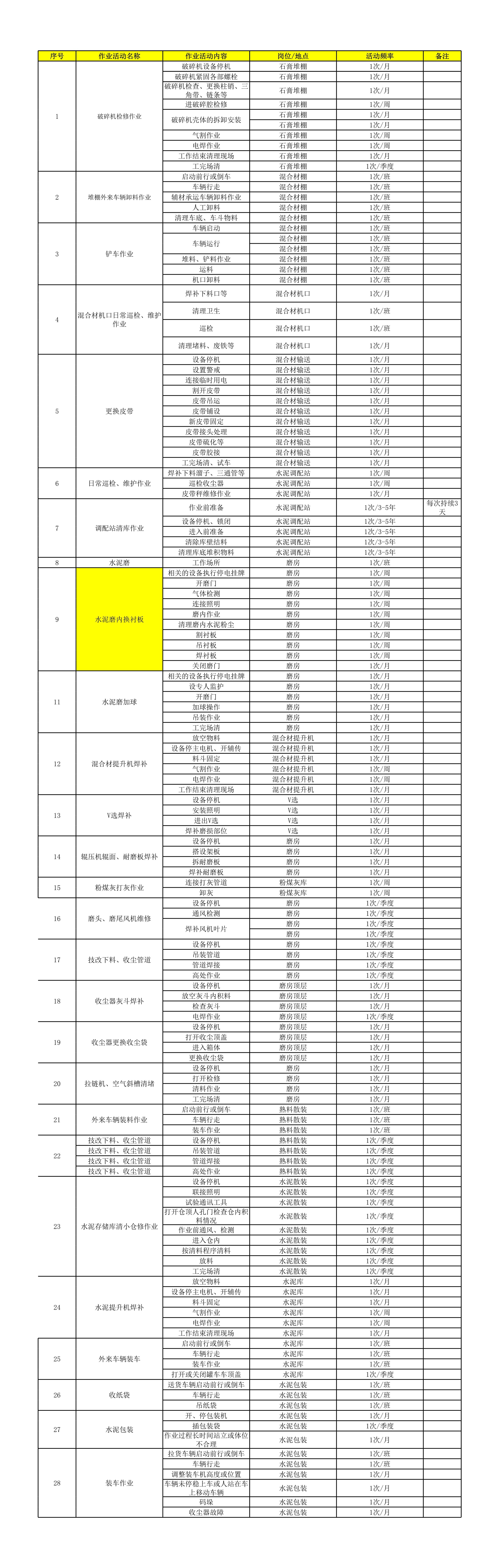 水泥车间--作业活动清单[表格]