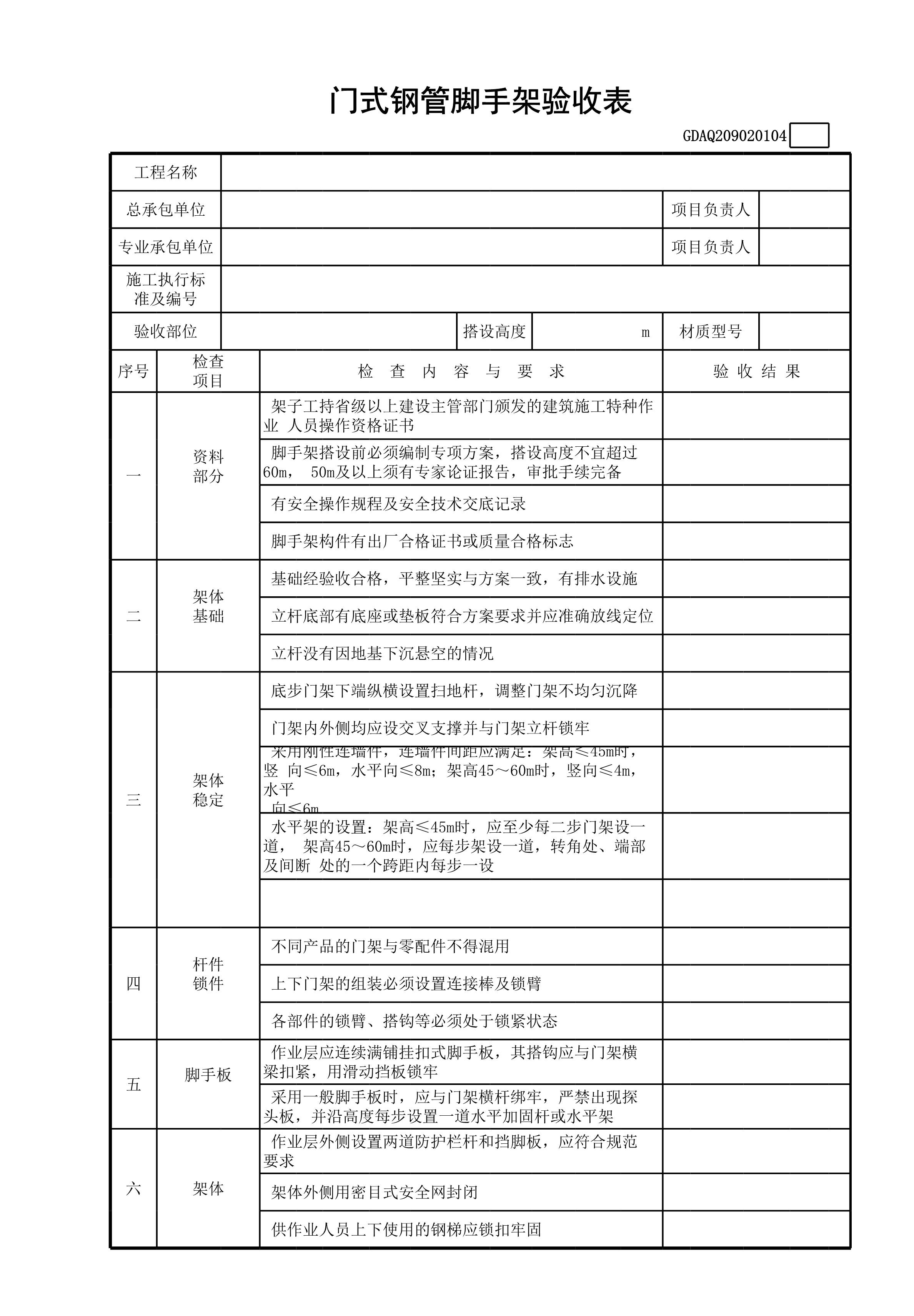 / 门式钢管脚手架验收表(含续表)GDAQ209020104[表格]