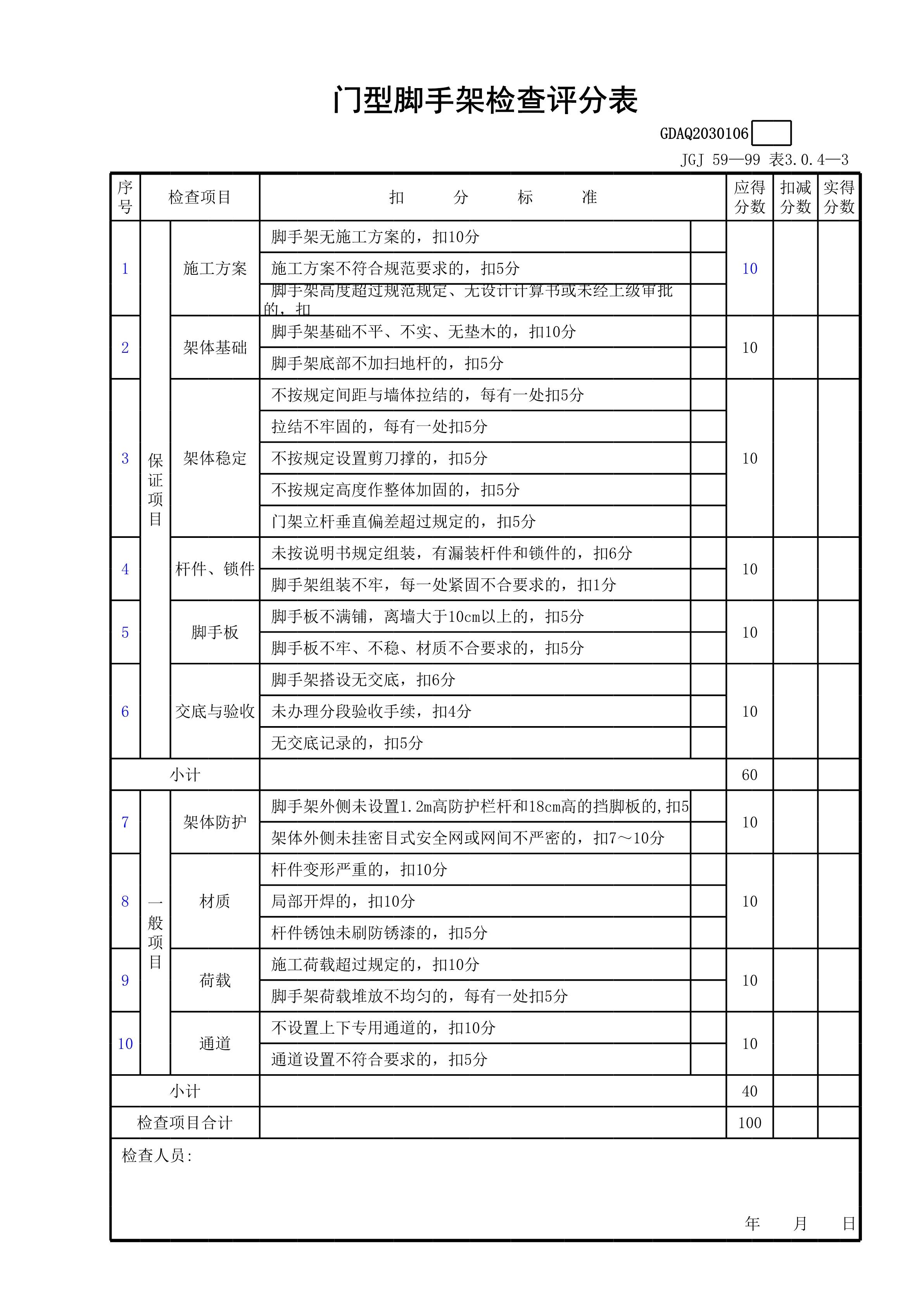 / 门型脚手架检查评分表GDAQ2030106[表格]