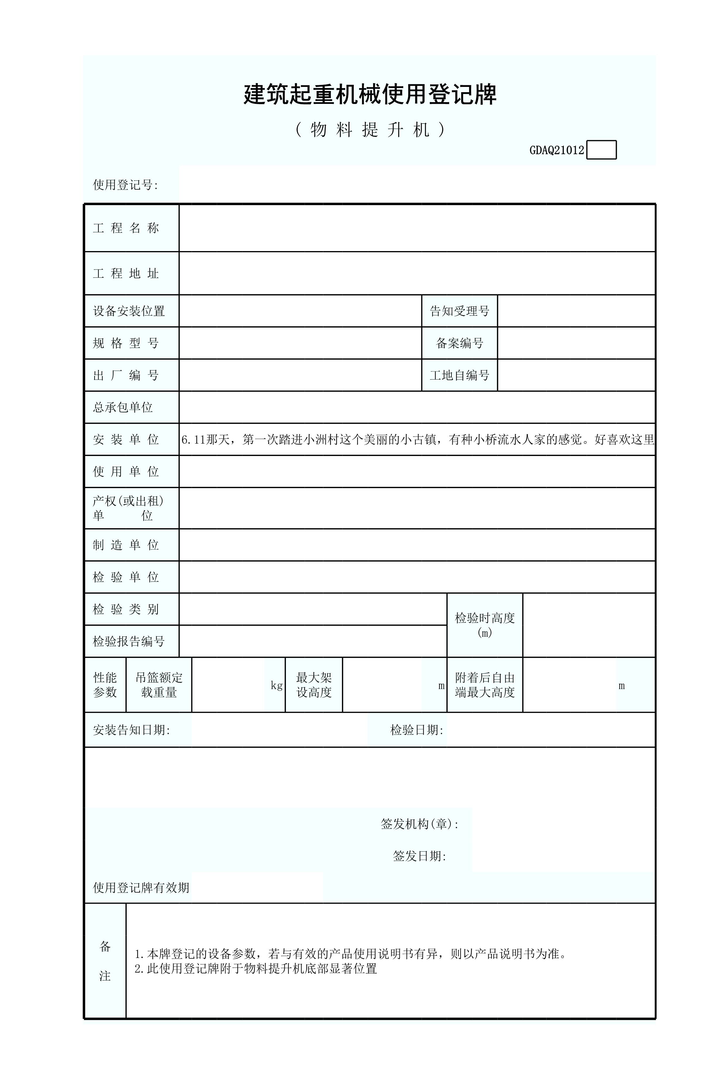 / 建筑起重机械使用登记牌(物料提升机)GDAQ21012[表格]