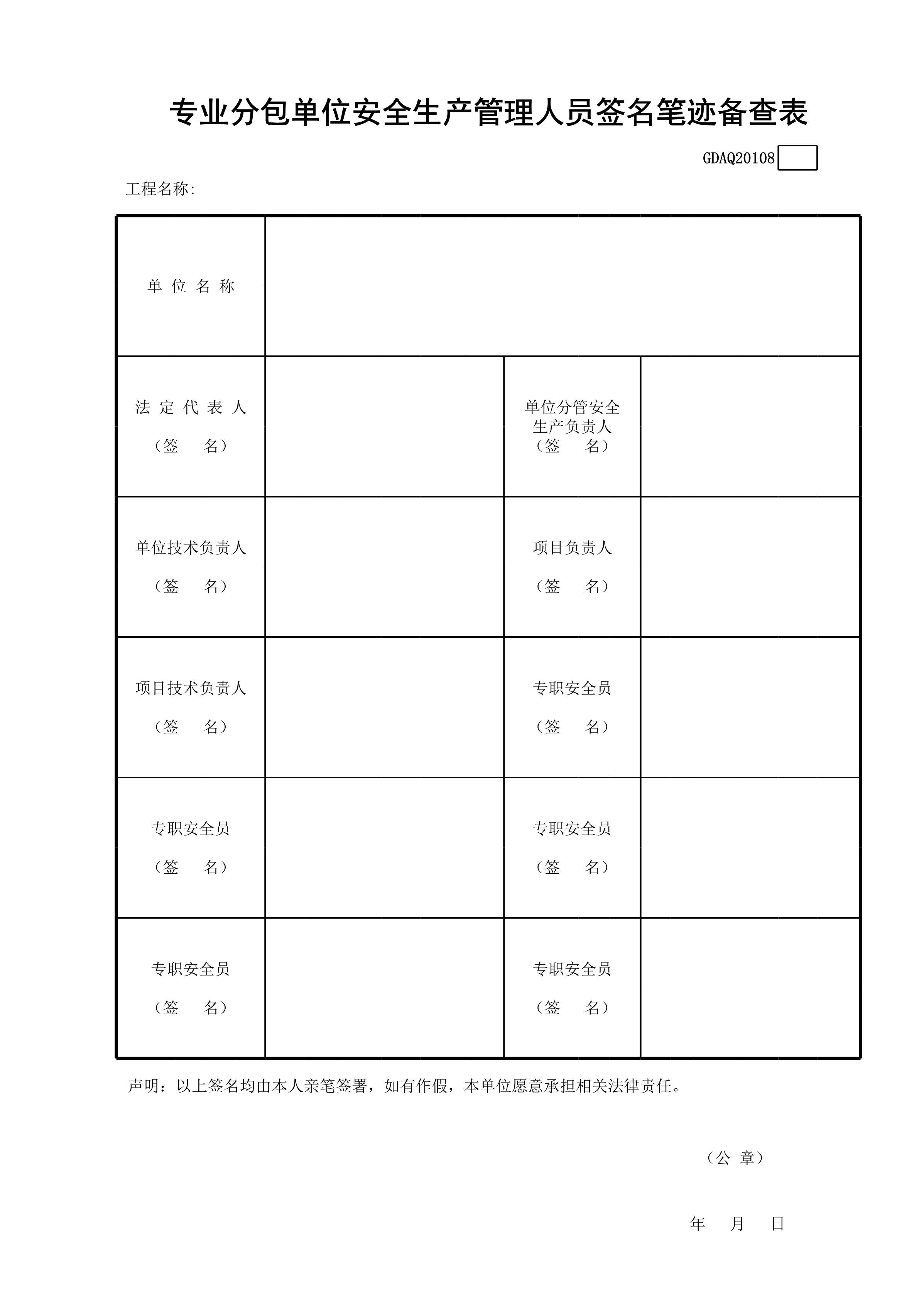 专业分包单位安全生产管理人员签名笔迹备查表GDAQ20108[表格]