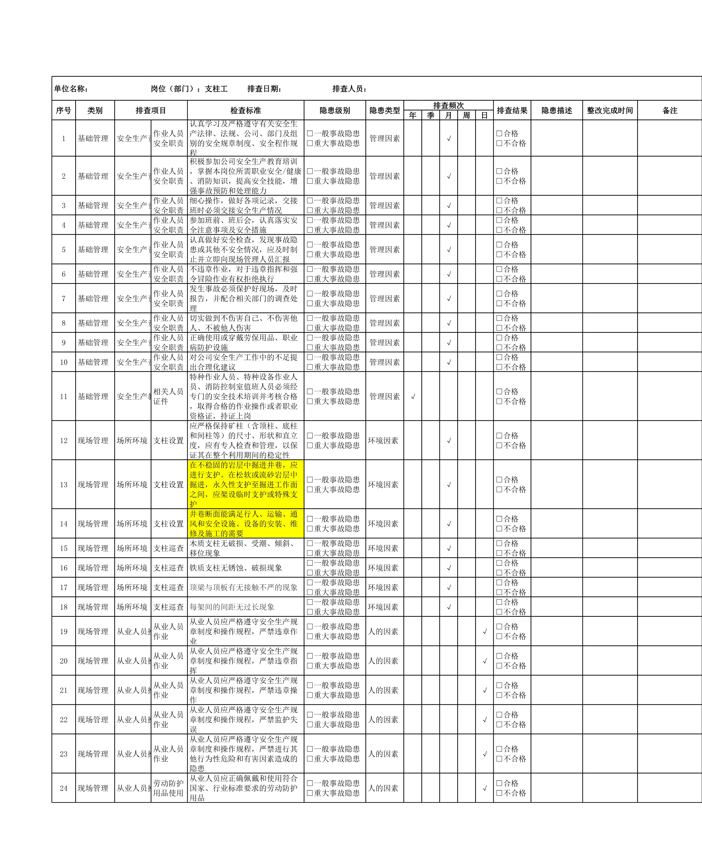 / 支柱工隐患排查清单[表格]