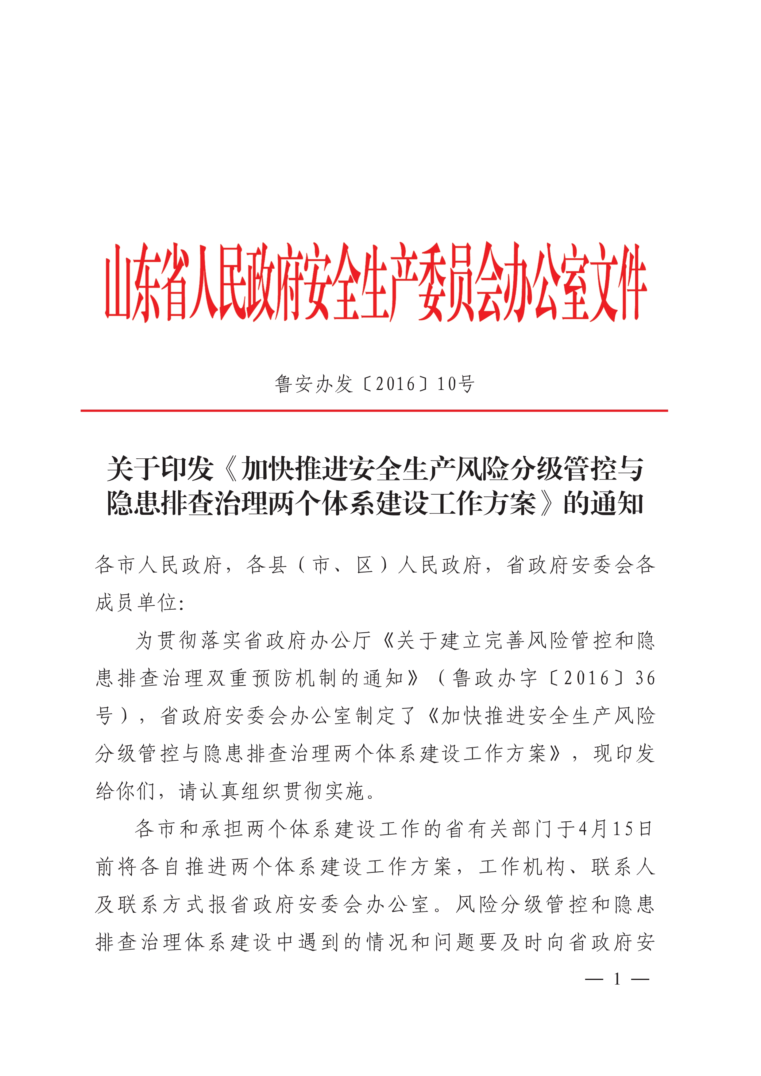 鲁安办发2016 10号关于印发《加快推进安全生产风险分级管控与隐患排查治理两个体系建设工作方案》的通知[PDF]