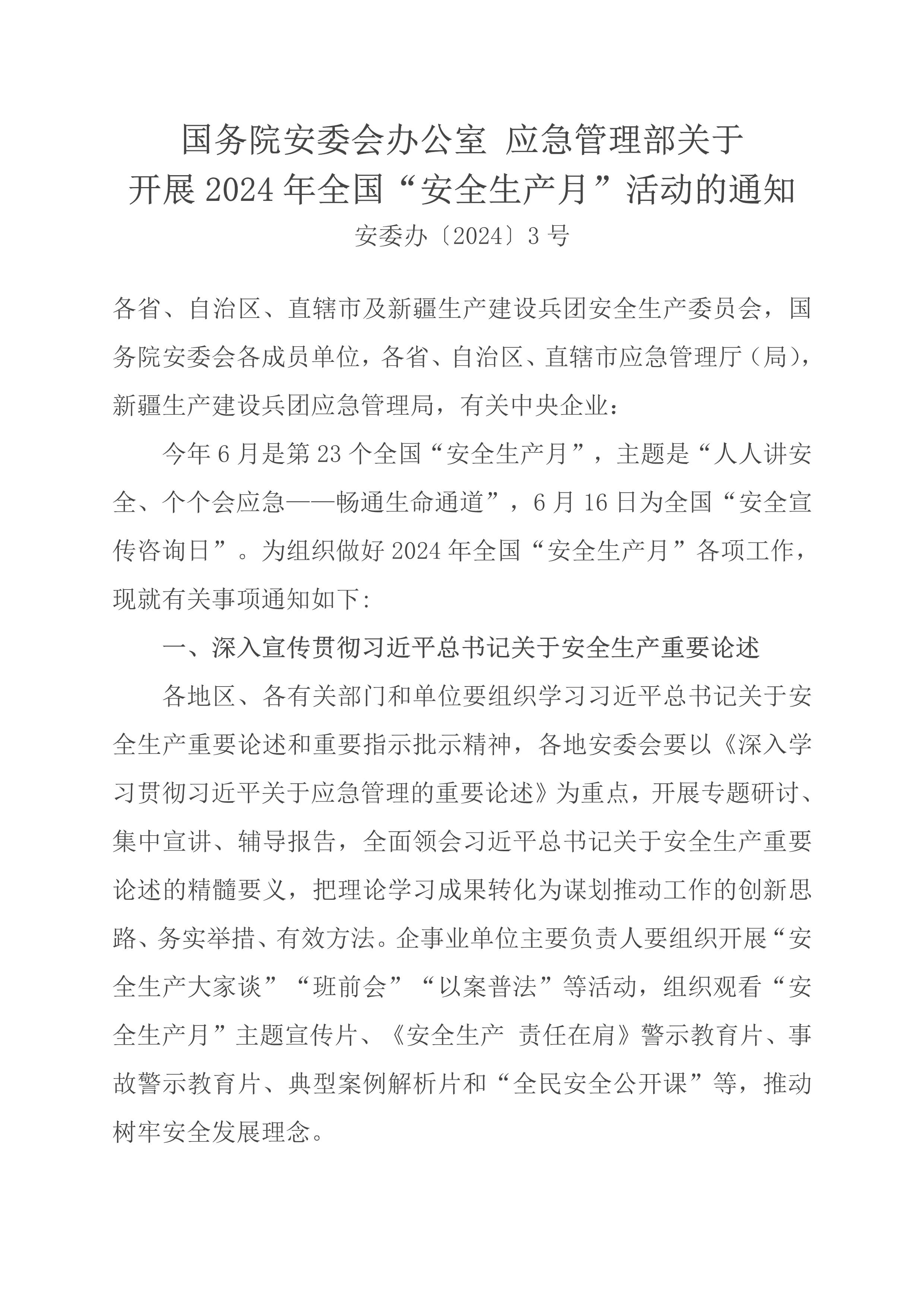 安委办20243号国务院安委会办公室应急管理部关于开展2024年全国安全生产月活动的通知[PDF]