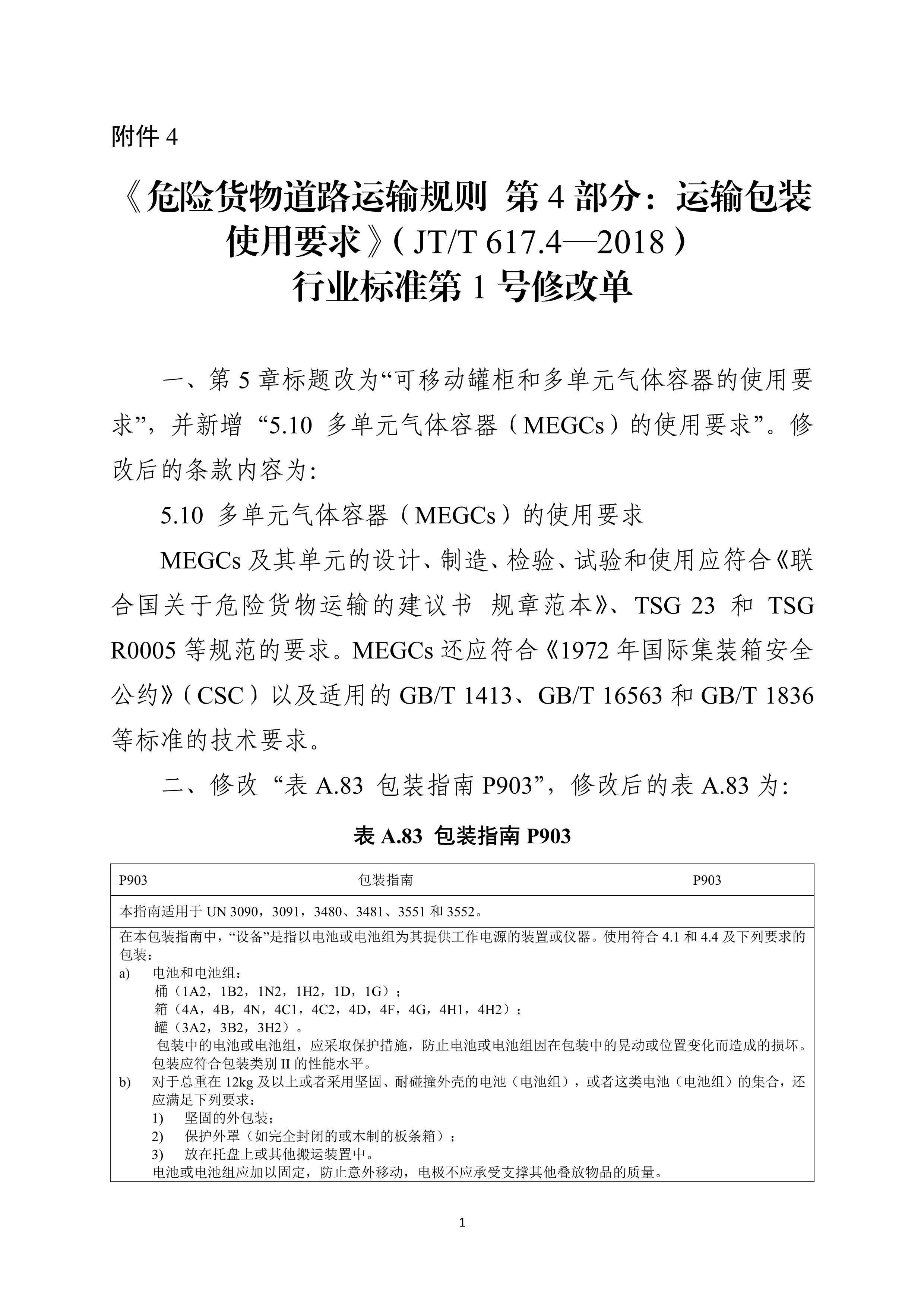 《危险货物道路运输规则运输包装使用要求》JTT617.4—2018行业标准第1号修改单[PDF]
