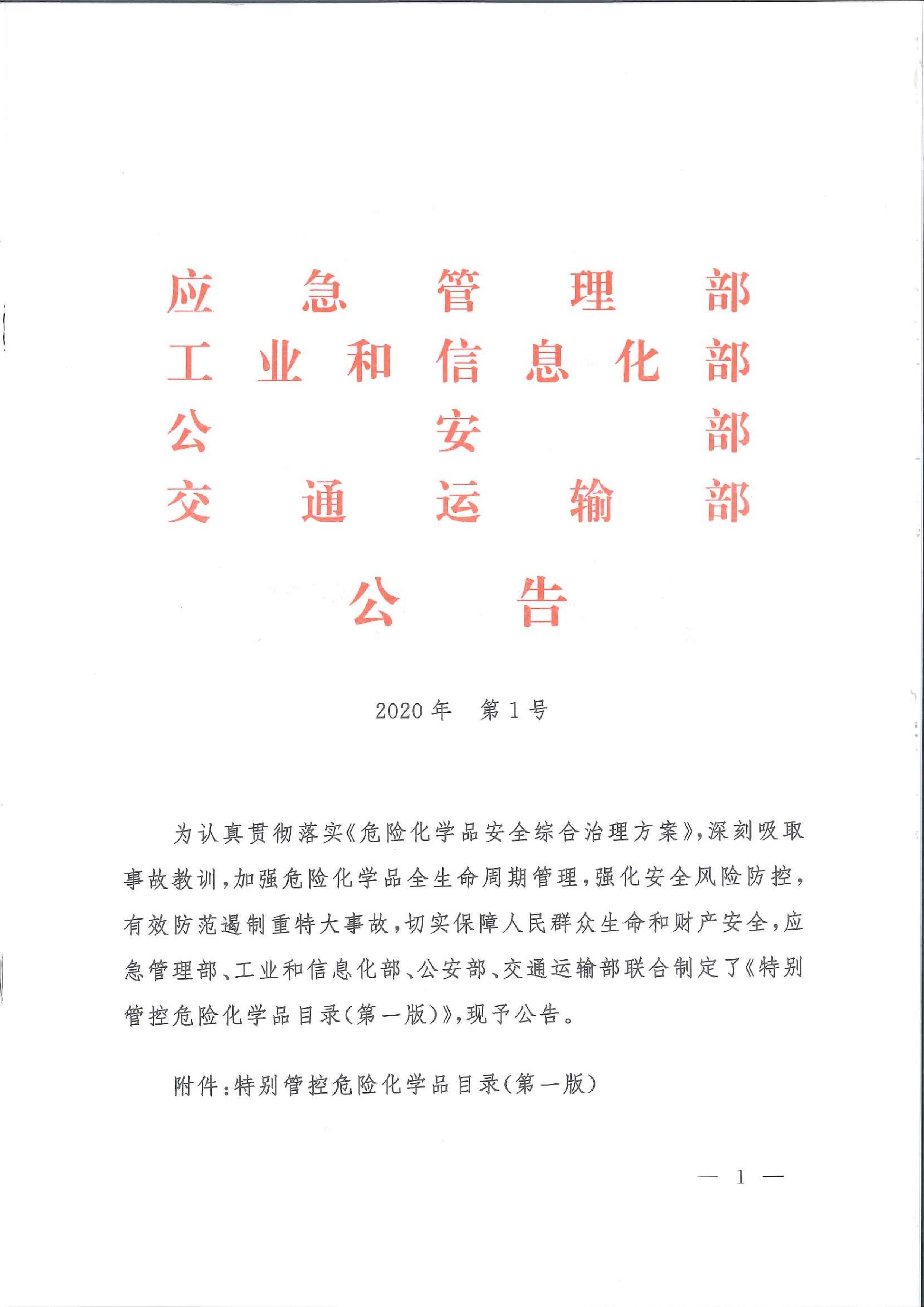 应急部工信部公安部交通部公告2020年第1号《特别管控危险化学品目录(第一版)》[PDF]