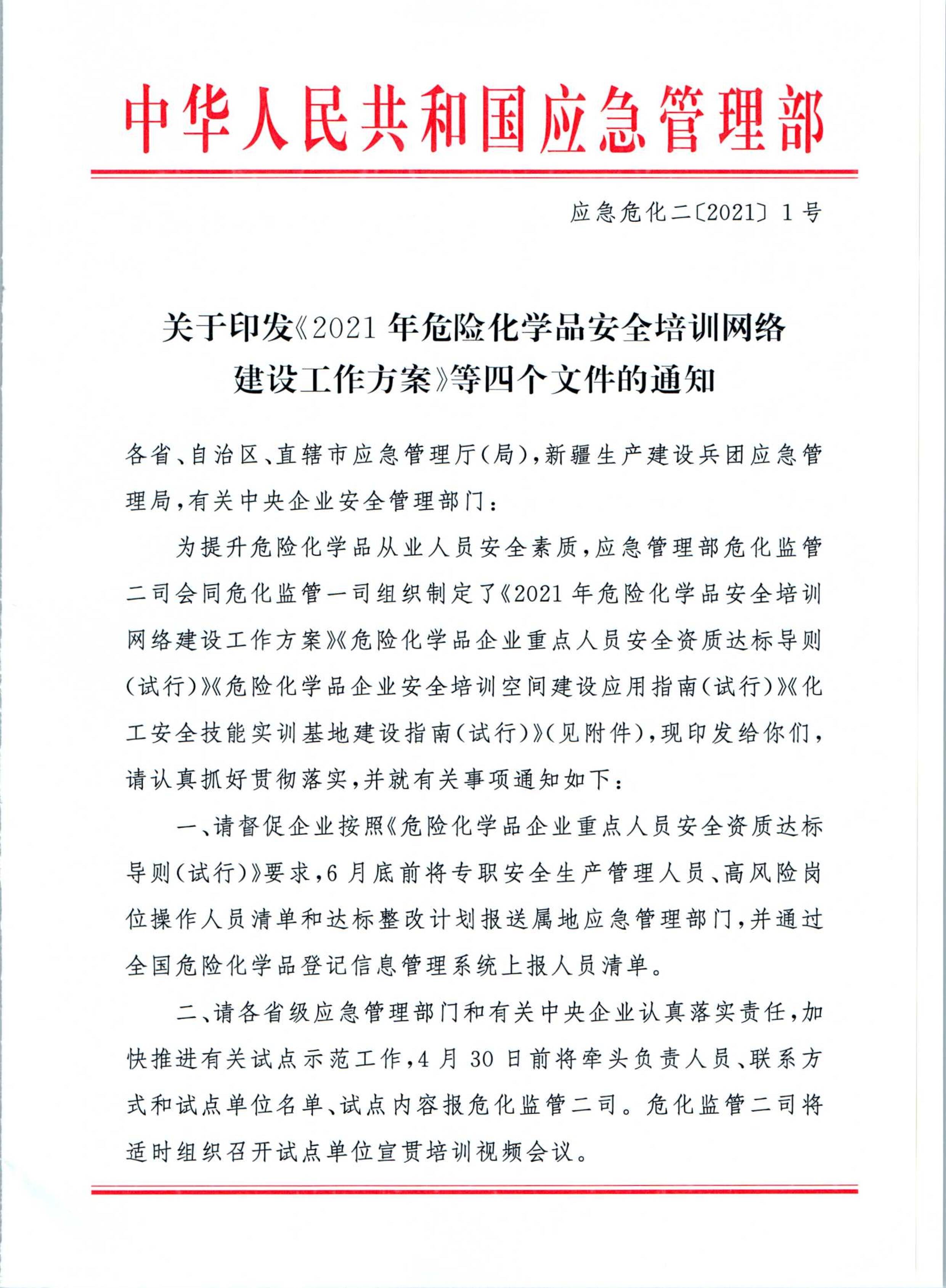 应急管理部危化监管二司关于印发《2021年危险化学品安全培训网络建设工作方案》等四个文件的通知[PDF]