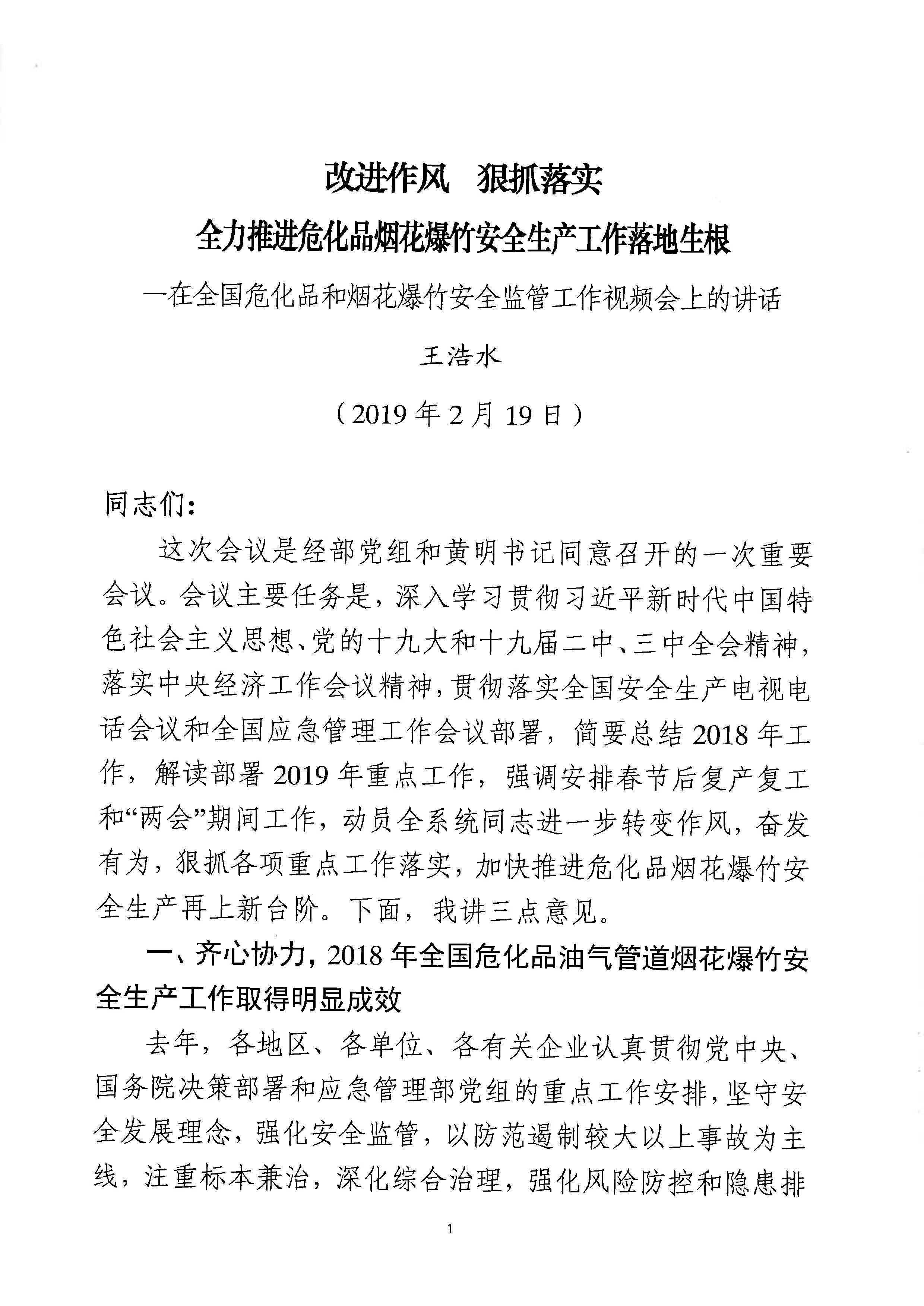 在全国危化品和烟花爆竹安全监管工作视频会上的讲话(王浩水)——《改进作风狠抓落实全力推进危化品烟花爆竹安全生产工作落地生根》[PDF]