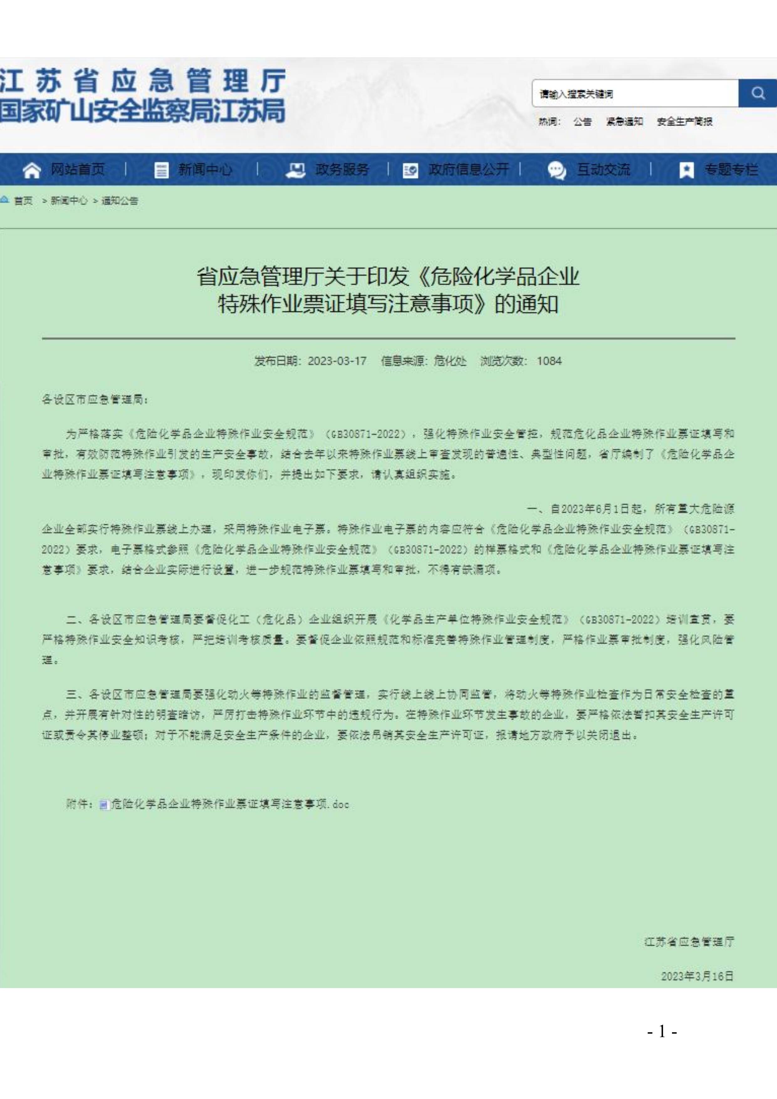 江苏省应急管理厅关于印发《危险化学品企业特殊作业票证填写注意事项》的通知[PDF]