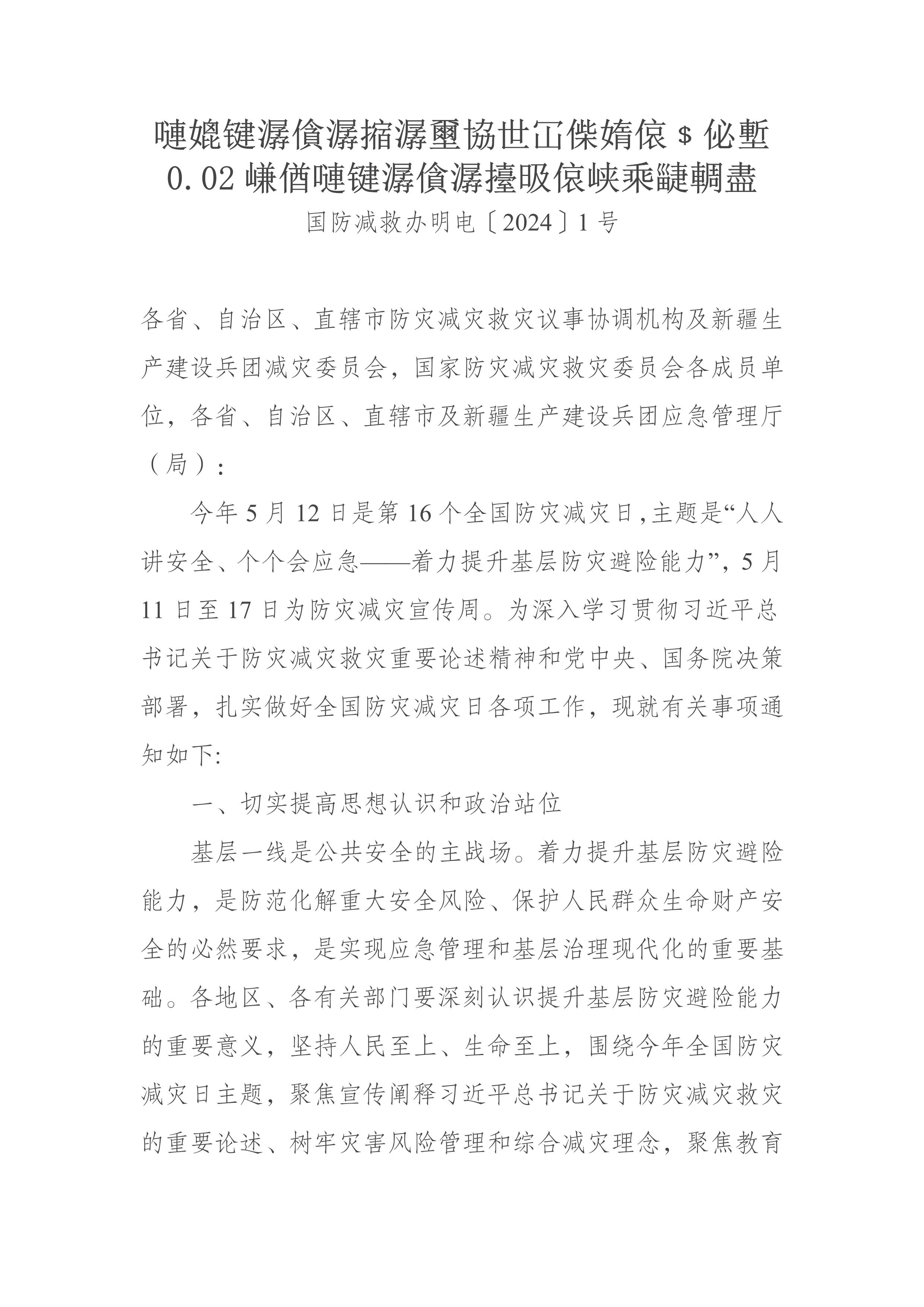 国防减救办明电20241号国家防灾减灾救灾委员会办公室关于做好2024年全国防灾减灾日有关工作的通知[PDF]