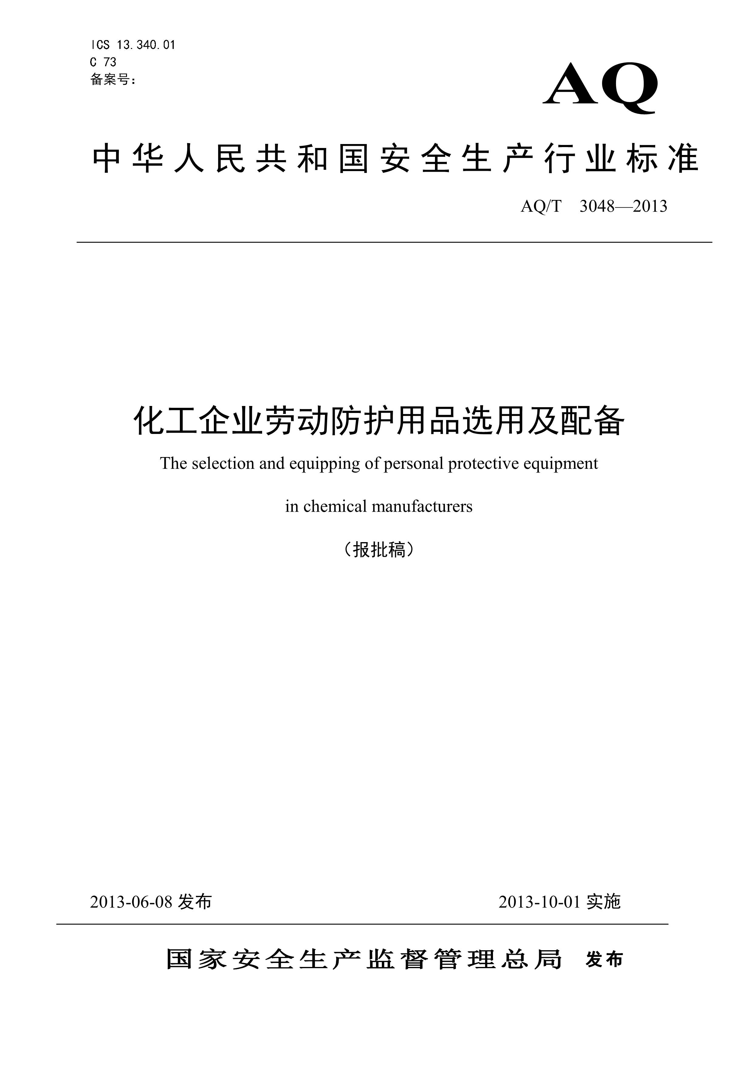 / 化工企业劳动防护用品选用及配备AQT3048-2013[PDF]