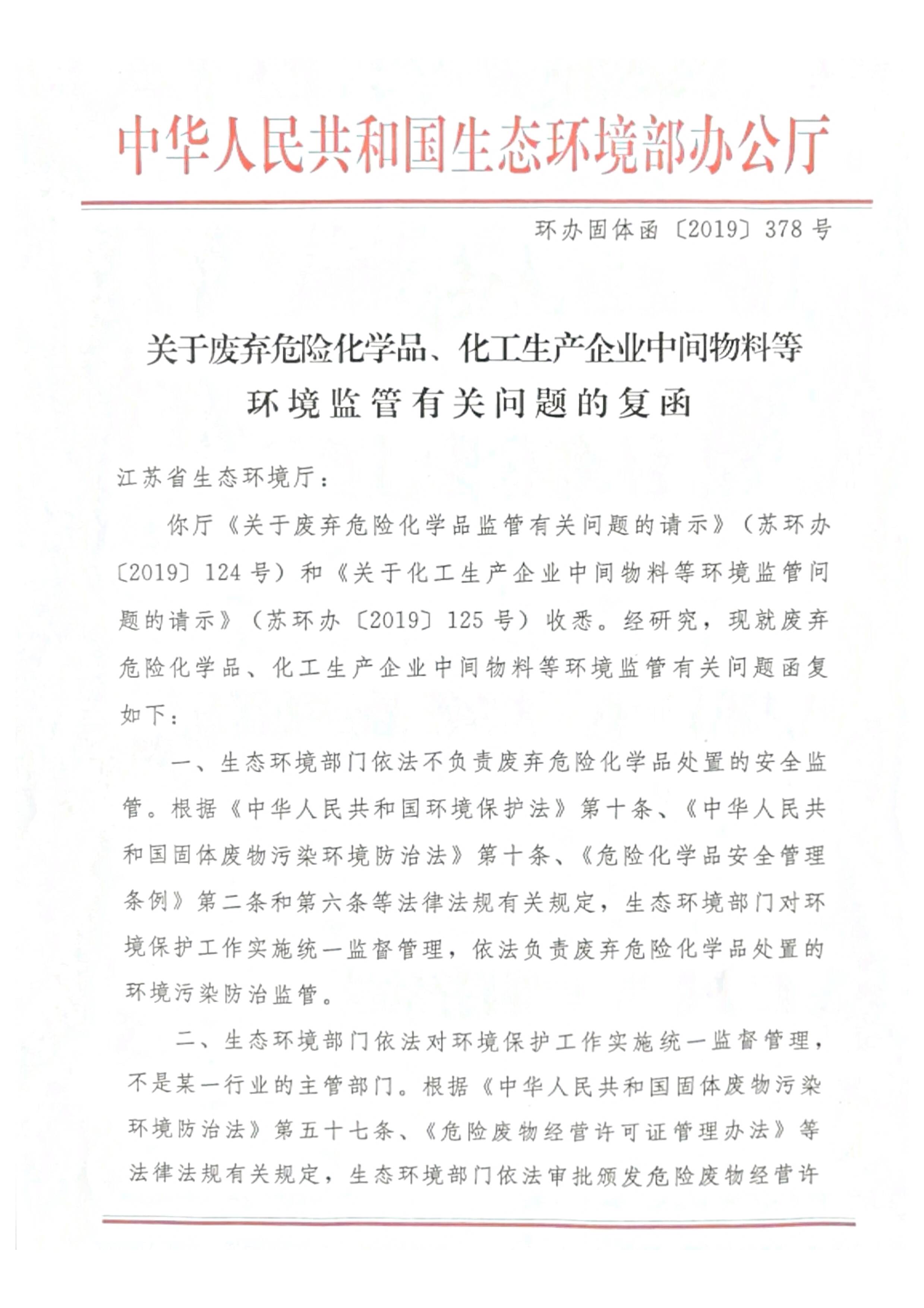 关于废弃危险化学品,化工生产企业中间物料等环境监管有关问题的复函(环办固体函2019378号)[PDF]