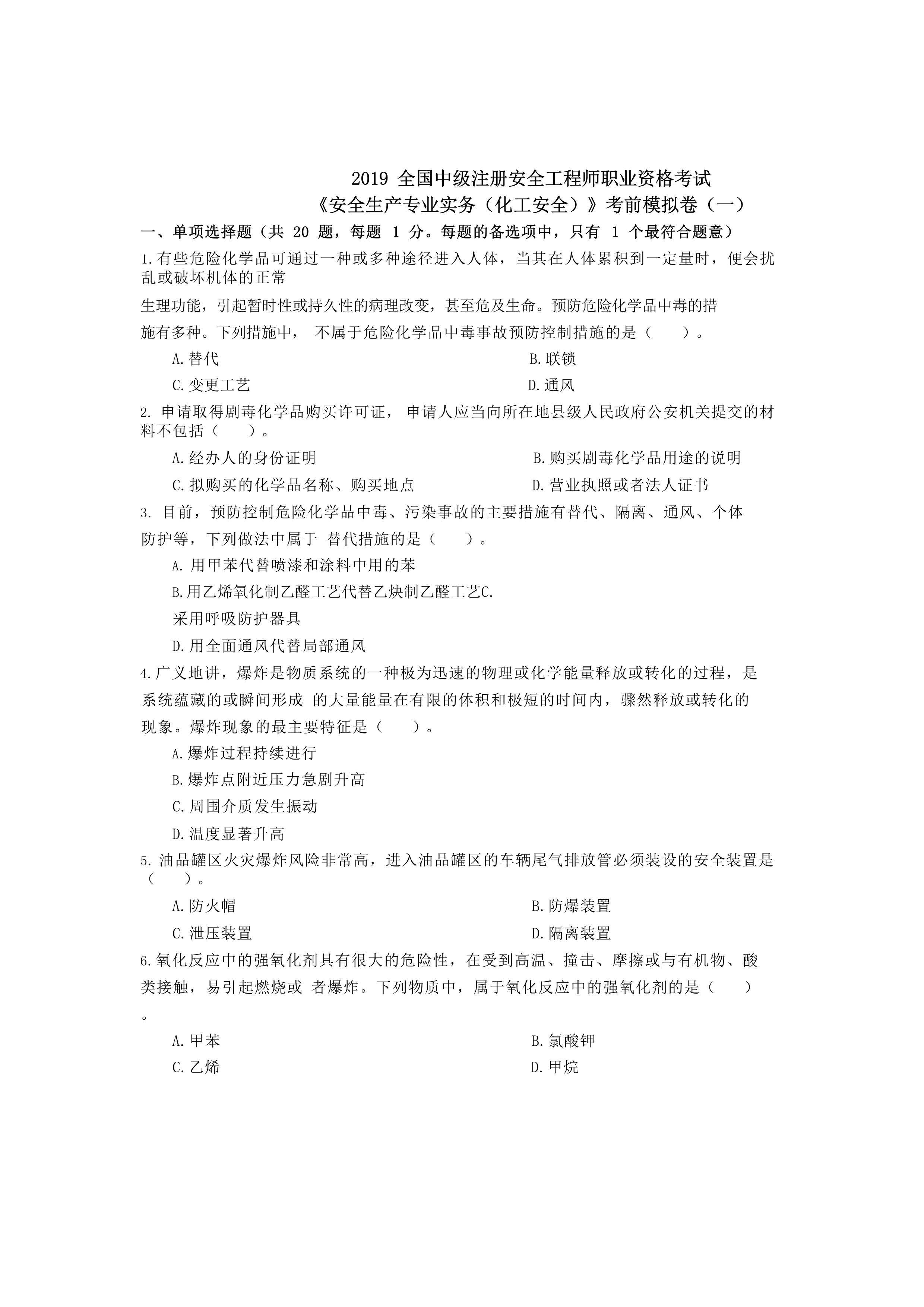 / 2019《安全生产专业实务》化工考前模拟卷及答案[PDF]