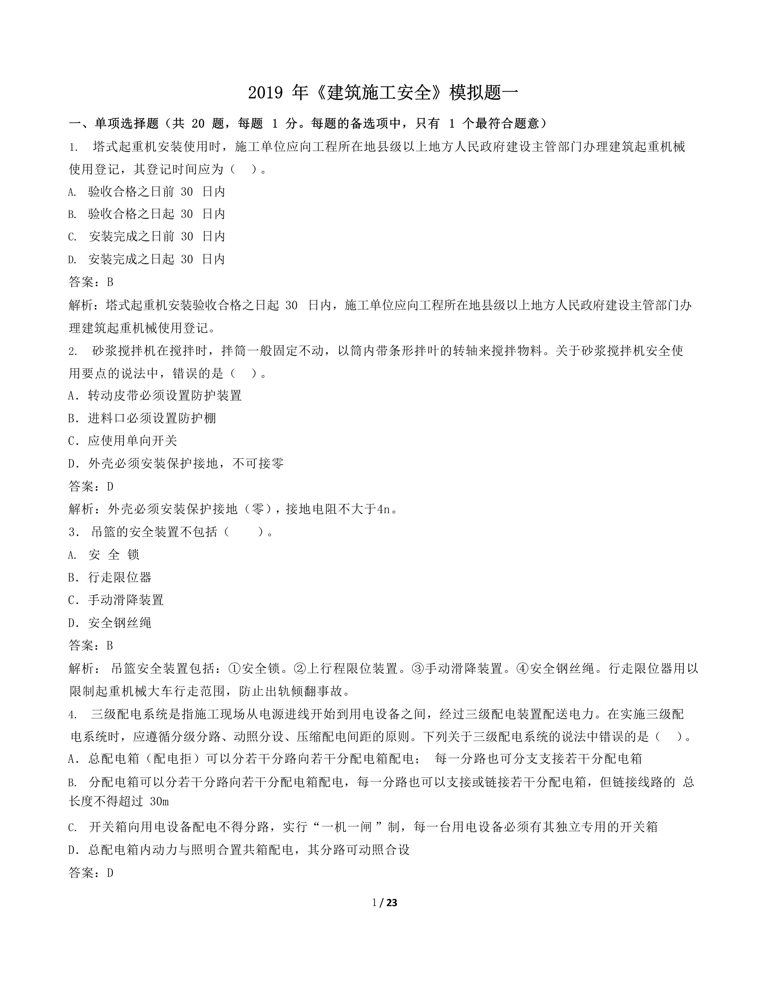 / 2019《安全生产专业实务》建筑安全模拟题一[PDF]