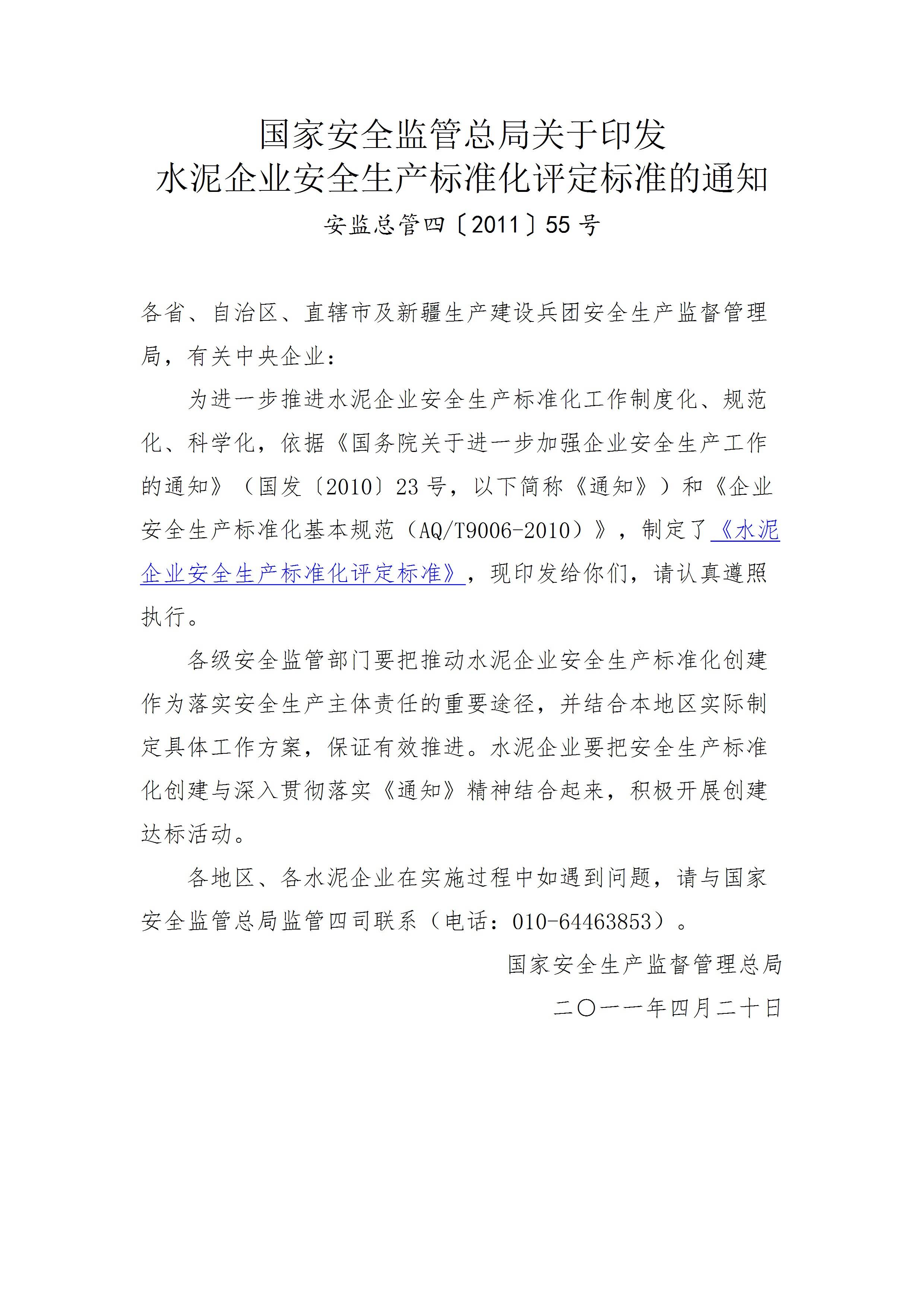 安监总管四(2011)55号水泥国家安全监管总局关于印发水泥企业安全生产标准化评定标准的通知[[文档]
